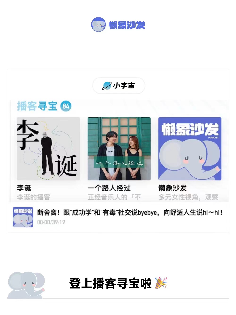 懒象沙发已同步更新在小宇宙|喜马拉雅|网易云|苹果Podcast,欢迎订阅