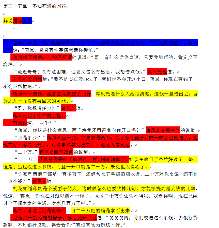 如果你想分析叙事,分析解说,描写,叙述的比例。就可以像这样用各种颜色标一下。