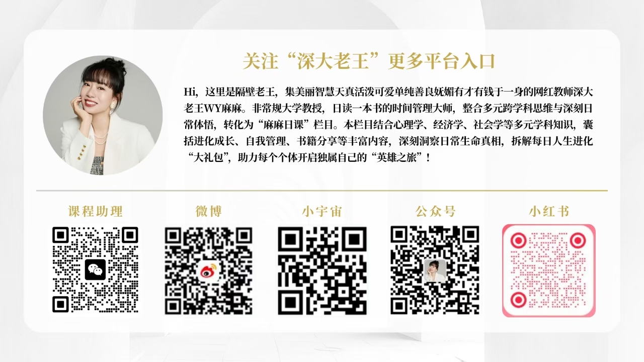✨深大老王WY麻麻,非常规大学教授,日读一本书的时间管理大师,整合多元跨学科思维与深刻日常体悟,转化为“麻麻日课”栏目。本栏目结合心理学、经济学、社会学等多元学科知识,囊括进化成长、自我管理、书籍分享等丰富内容,深刻洞察日常生命真相,拆解每日人生进化“大礼包”,助力每个个体开启独属自己的“英雄之旅”!