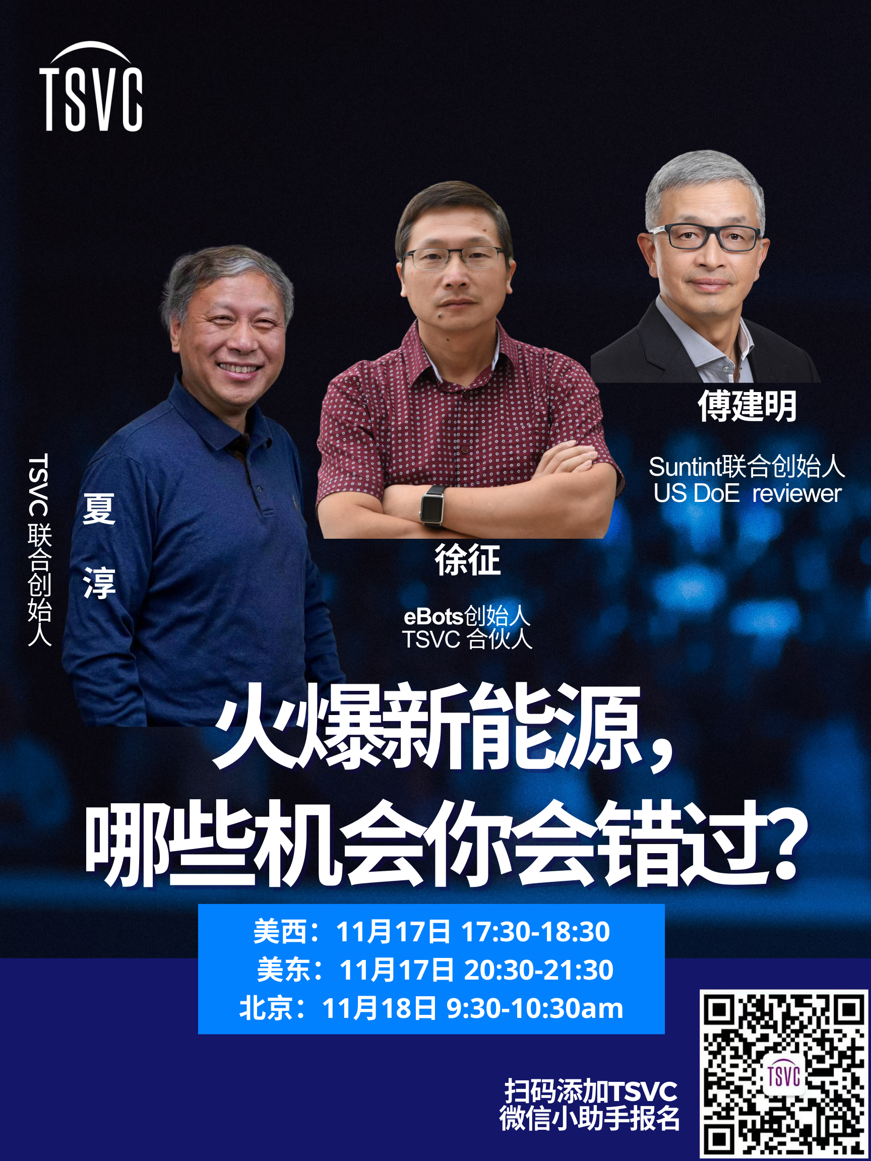 TSVC举办了《打造下一个独角兽》讲座第23讲。本次讨论从点到面,从宏观策略到具体投资创业的案例,来探讨在新能源领域的投资创业的机会和挑战。