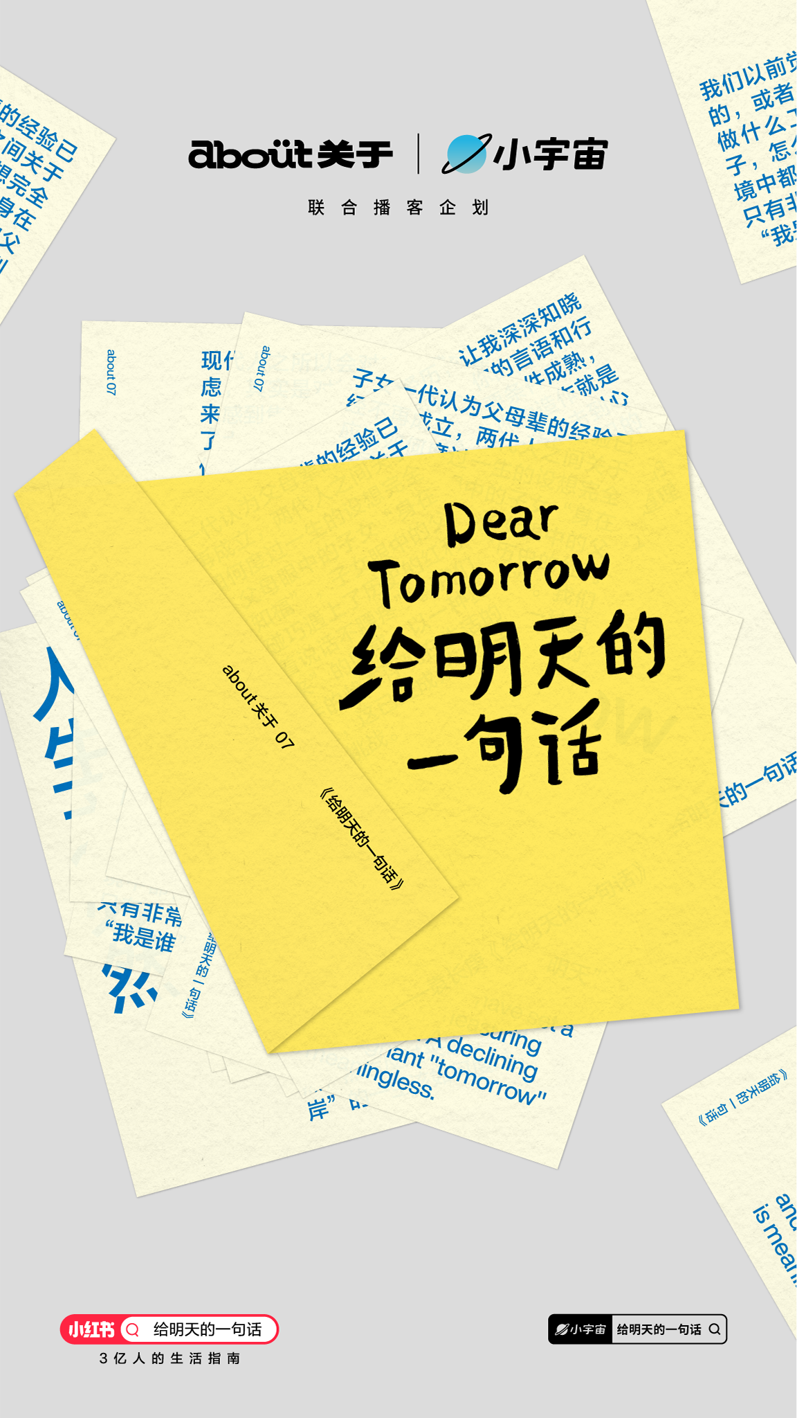 P.S. 小红书官方杂志书「about关于」与小宇宙共同发起「给明天的一句话」毕业季特别企划,希望通过自我养育、亲密关系、技术焦虑、重建意义等议题的探讨,和大家一起思考「我们如何面对不确定的明天?」欢迎在小红书和小宇宙搜索「给明天的一句话」,进入活动页了解更多。