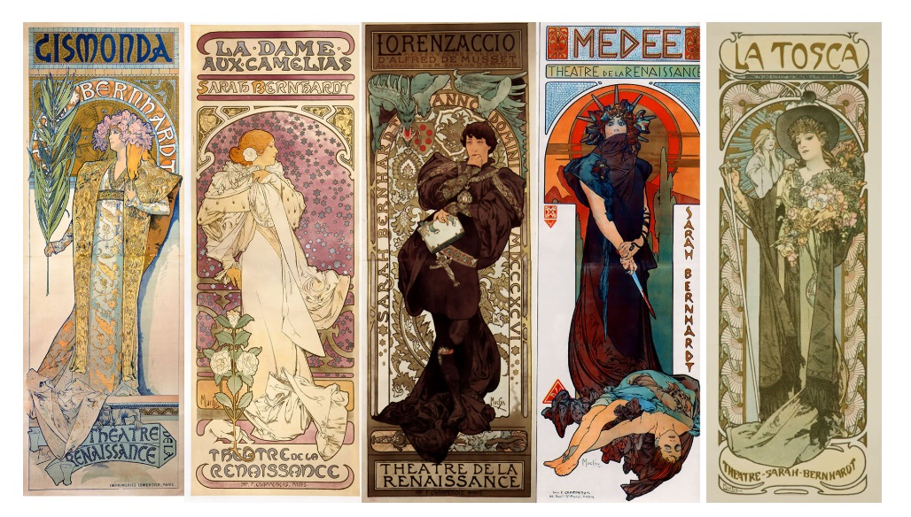 穆夏为名演员莎拉.伯恩哈特主演的戏剧创作的海报,第一幅即为其成名作《吉斯蒙达》