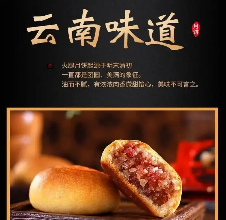 体现了云南人对咸香味道的偏爱,云南人喜欢腌制和烟熏的食物,火腿、腊排骨等都是餐桌上的常客,因此火腿月饼也自然成了滇南地区的代表。