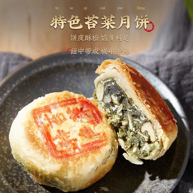 苔菜月饼又称宁式苔菜月饼,是浙江宁波地区的传统特色月饼,以苔菜为辅料作馅的一种月饼,饼皮松酥,馅料有浓郁的麻油香味,甜中带咸,咸里透鲜,有苔菜的特殊香味。