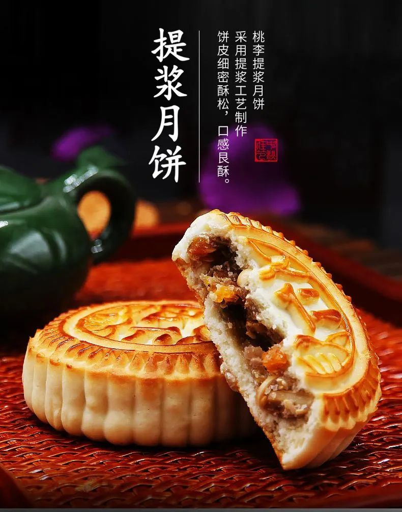 提浆月饼的特色就是皮与馅的比例一样多,内馅比广式少了许多,多加了一些面粉,又有一股特有的香气,所以吃起来扎扎实实。香气的来源是因为内馅拌有麻油,因为少了许多油与糖,提浆月饼放在室温中,足足可以保鲜一个月。