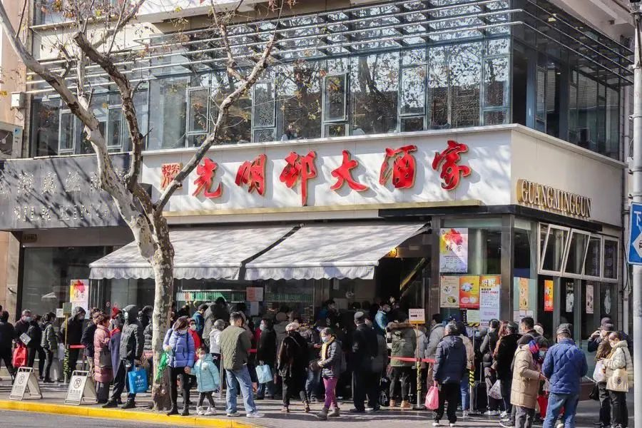 光明村大酒家是淮海路上的老字号名店。一楼的外卖窗口供应各式自制的点心、糕团与熟菜、卤味,常年都排着长队;二楼主要供应各种中式传统小吃点心;