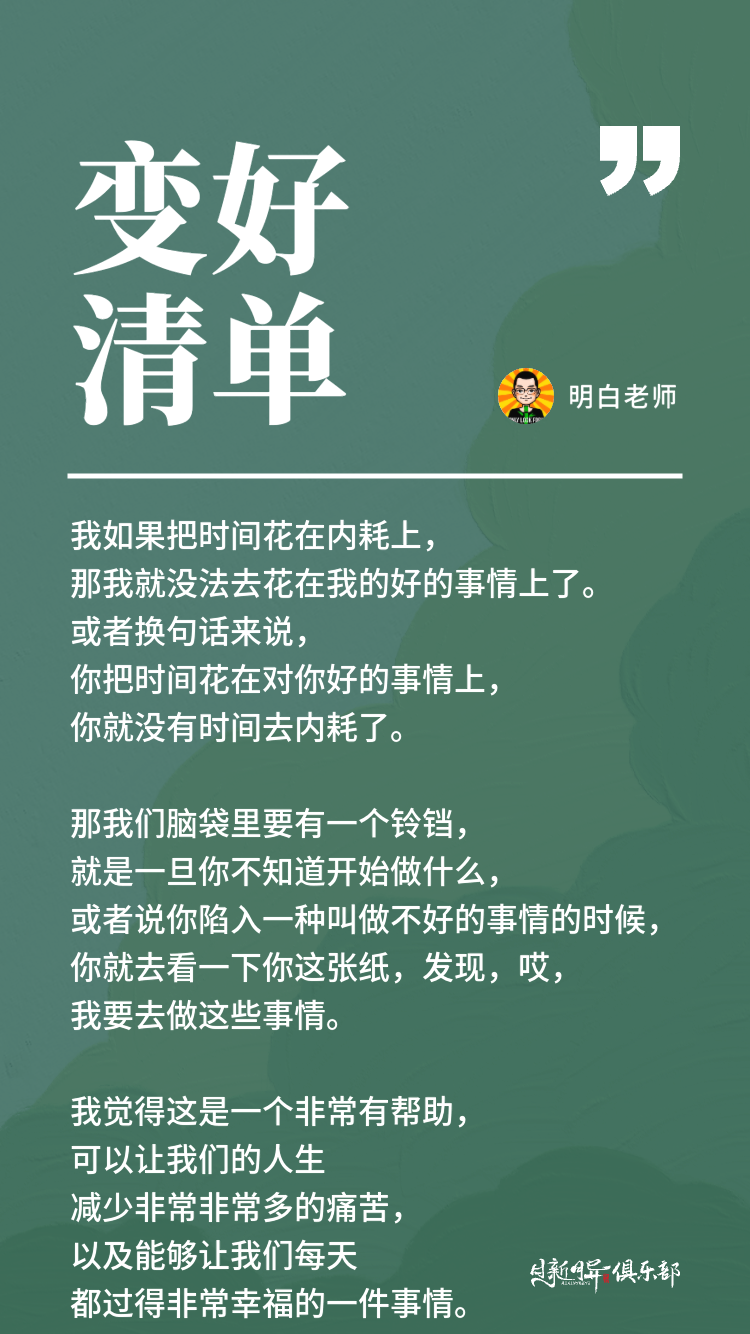我如果把时间花在内耗上,那我就没法去花在我的好的事情上了。或者换句话来说,你把时间花在对你好的事情上,你就没有时间去内耗了。那我们脑袋里要有一个铃铛,就是一旦你不知道开始做什么,或者说你陷入一种叫做不好的事情的时候,你就去看一下你这张纸,发现,哎,我要去做这些事情。