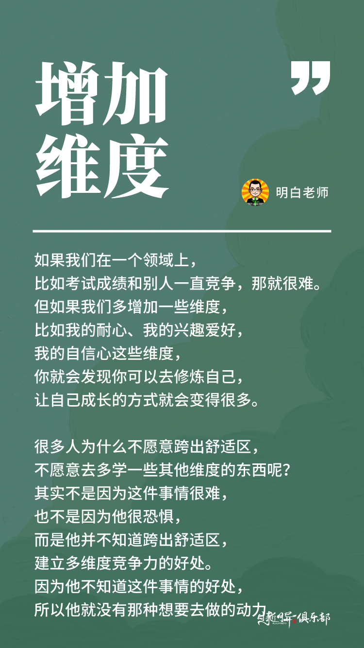 很多人为什么不愿意跨出舒适区,不愿意去多学一些其他维度的东西呢?其实不是因为这件事情很难,也不是因为他很恐惧,而是他并不知道跨出舒适区,建立多维度竞争力的好处。因为他不知道这件事情的好处,所以他就没有那种想要去做的动力。