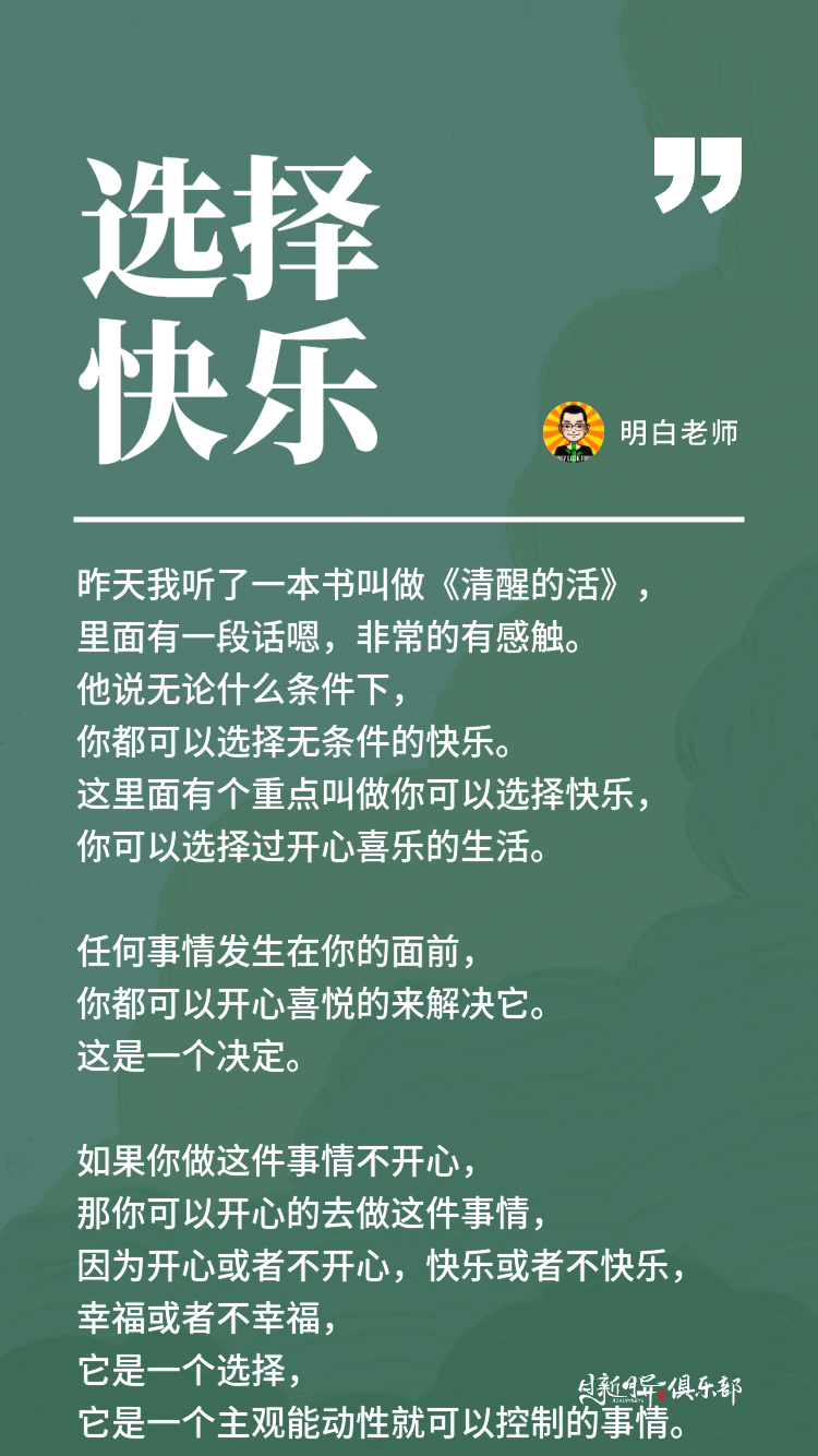 昨天我听了一本书叫做《清醒的活》,里面有一段话嗯,非常的有感触。他说无论什么条件下,你都可以选择无条件的快乐。这里面有个重点叫做你可以选择快乐,你可以选择过开心喜乐的生活。任何事情发生在你的面前,你都可以开心喜悦的来解决它。这是一个决定。