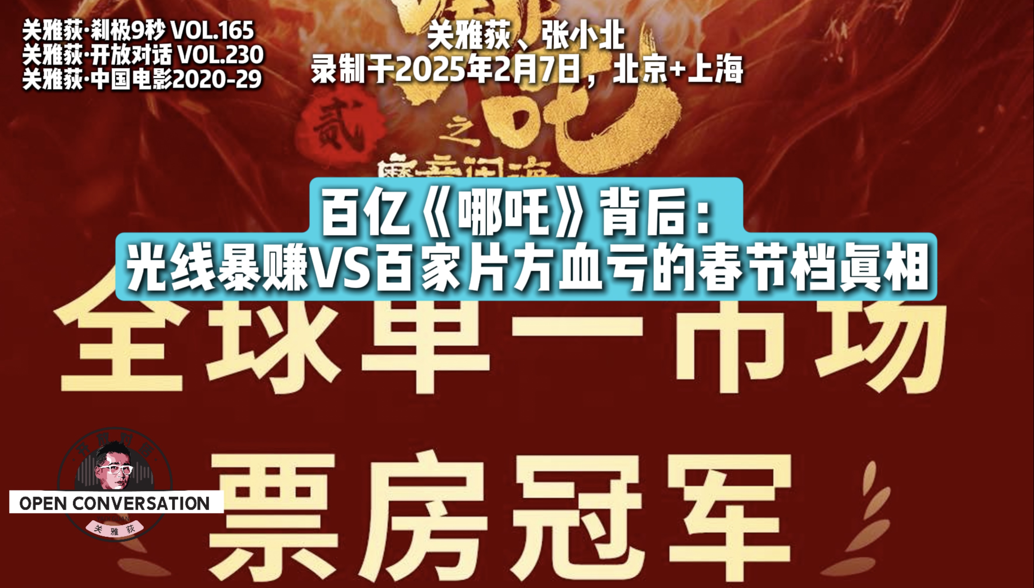 本期节目是资深电影人关雅荻与编剧导演张小北围绕2025年春节档电影的深度对谈,围绕春节档六部主力影片展开专业剖析。节目开场即点明中国电影市场"春节档定全年"的特殊格局,两位从业者从产业现状、创作逻辑与观众心理多维度切入,展现出对行业生态的深刻洞察。