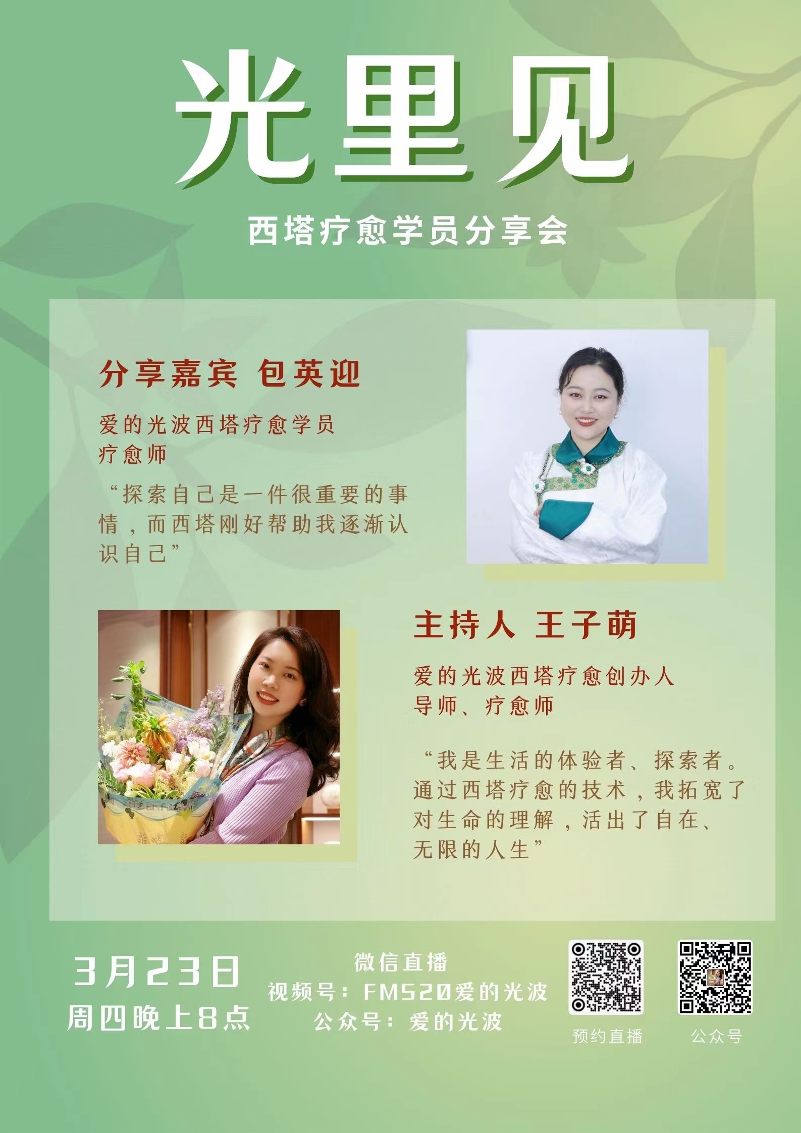 伙伴你好,我是萌萌,是播客《爱的光波》主理人,也是一名西塔疗愈师、导师。《光里见》是西塔疗愈方向的专题录播,每一期,我会邀请西塔疗愈师、导师们来分享ta们的西塔疗愈之旅
