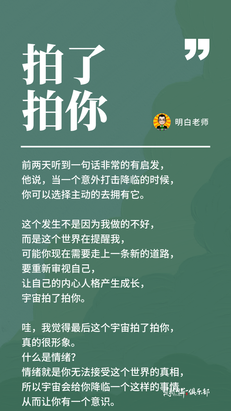 前两天听到一句话非常的有启发,他说,当一个意外打击降临的时候,你可以选择主动的去拥有它。这个发生不是因为我做的不好,而是这个世界在提醒我,可能你现在需要走上一条新的道路,要重新审视自己,让自己的内心人格产生成长,宇宙拍了拍你。