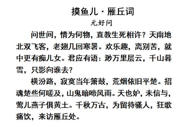 “问世间情为何物,直教人生死相许”这一句都非常熟悉。"在金庸武侠名著《神雕侠侣》中,为情所困的李莫愁常常会引用此句而被广为流传。