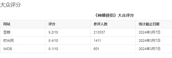 94版《射雕》虽制作略显粗糙,但演员表演出色,特别是朱茵与张智霖的人物塑造,成功改变了观众对83版《射雕》的固有印象,成为广大80后、90后印象深刻的一版