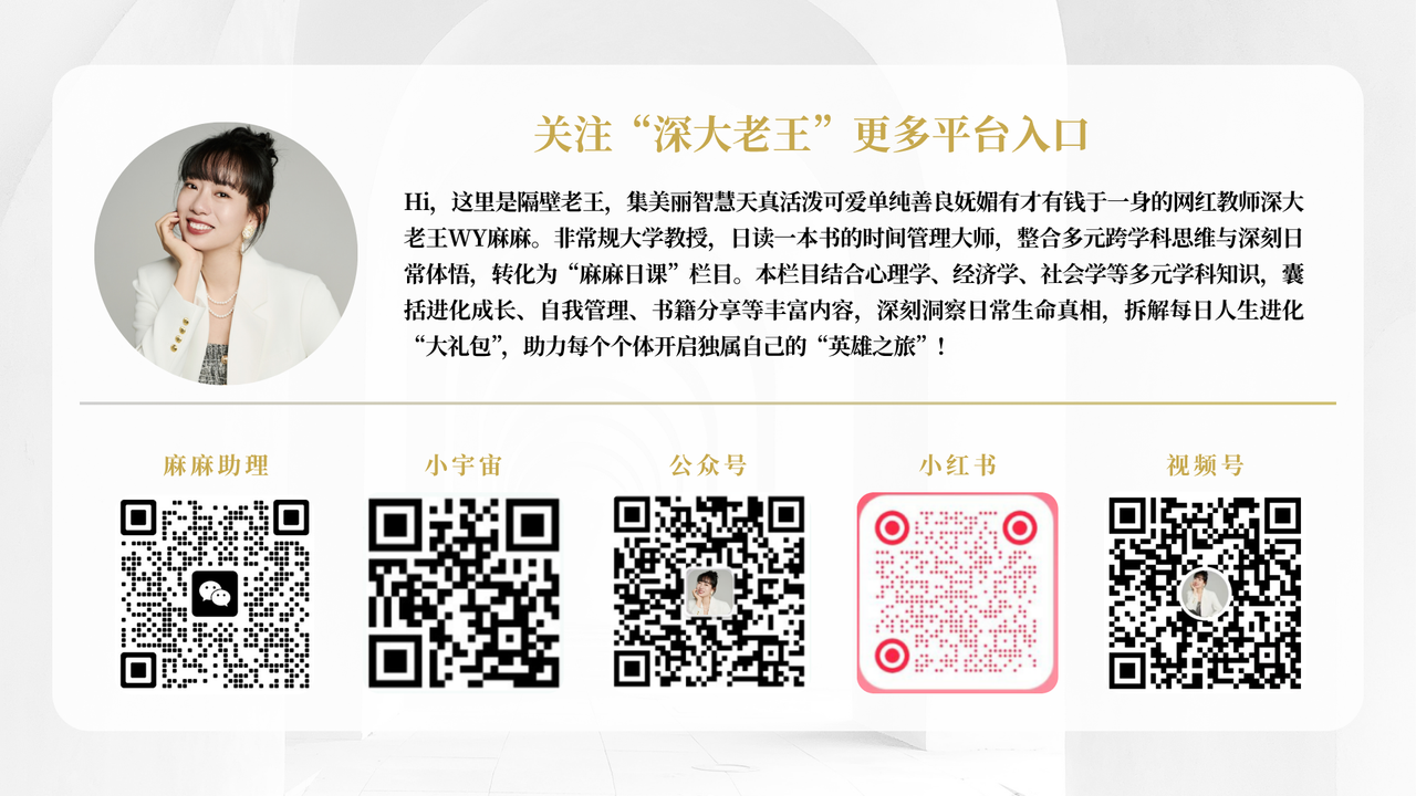 ✨深大老王WY麻麻,非常规大学教授,日读一本书的时间管理大师,整合多元跨学科思维与深刻日常体悟,转化为“麻麻日课”栏目。本栏目结合心理学、经济学、社会学等多元学科知识,囊括进化成长、自我管理、书籍分享等丰富内容,深刻洞察日常生命真相,拆解每日人生进化“大礼包”,助力每个个体开启独属自己的“英雄之旅”!