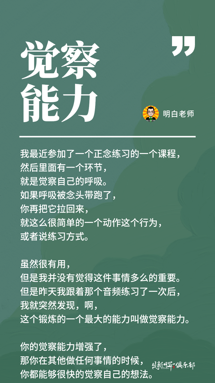 虽然大家都是很有用,但是我并没有因此而觉得这件事情多么的重要,而去把这件事情当成一个很重要的事情,去认真坚持的去做。但是昨天我跟着那个音频练习了一次后,我就突然发现,啊,这个锻炼的一个最大的能力叫做觉察能力。