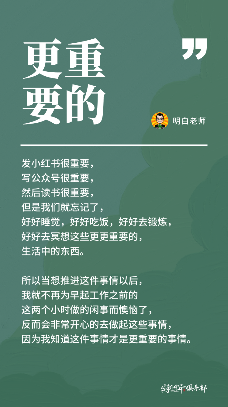 发小红书很重要,写公众号很重要,然后读书很重要,但是我们就忘记了,好好睡觉,好好吃饭,好好去锻炼,好好去冥想这些更更重要的,生活中的东西。所以当想推进这件事情以后,我就不再为早起工作之前的这两个小时做的闲事而懊恼了,反而会非常开心的去做起这些事情,因为我知道这件事情才是更重要的事情。