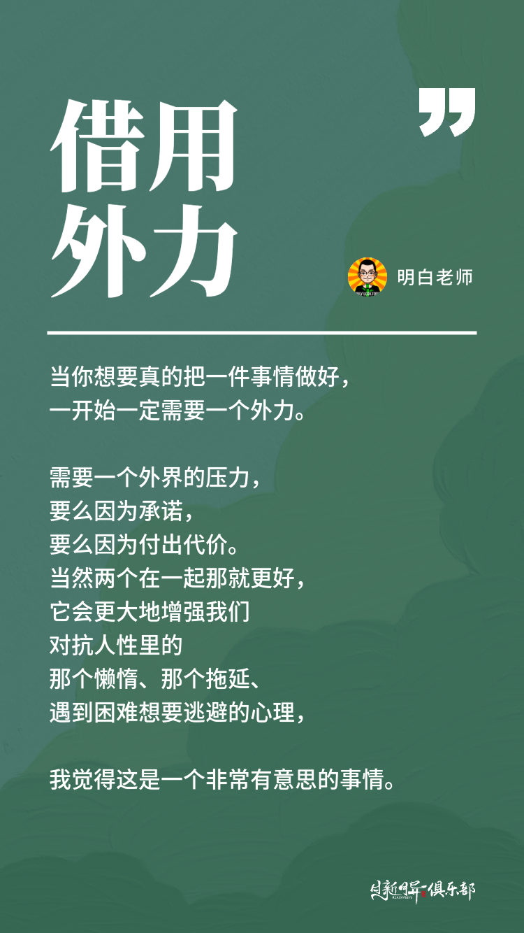 所以当你想要真的把一件事情做好,一开始一定需要一个外力,需要一个外界的压力,要么因为承诺,要么因为付出代价。当然两个在一起那就更好,它会更大地增强我们对抗人性里的那个懒惰、那个拖延、遇到困难想要逃避的心理,我觉得这是一个非常有意思的事情。