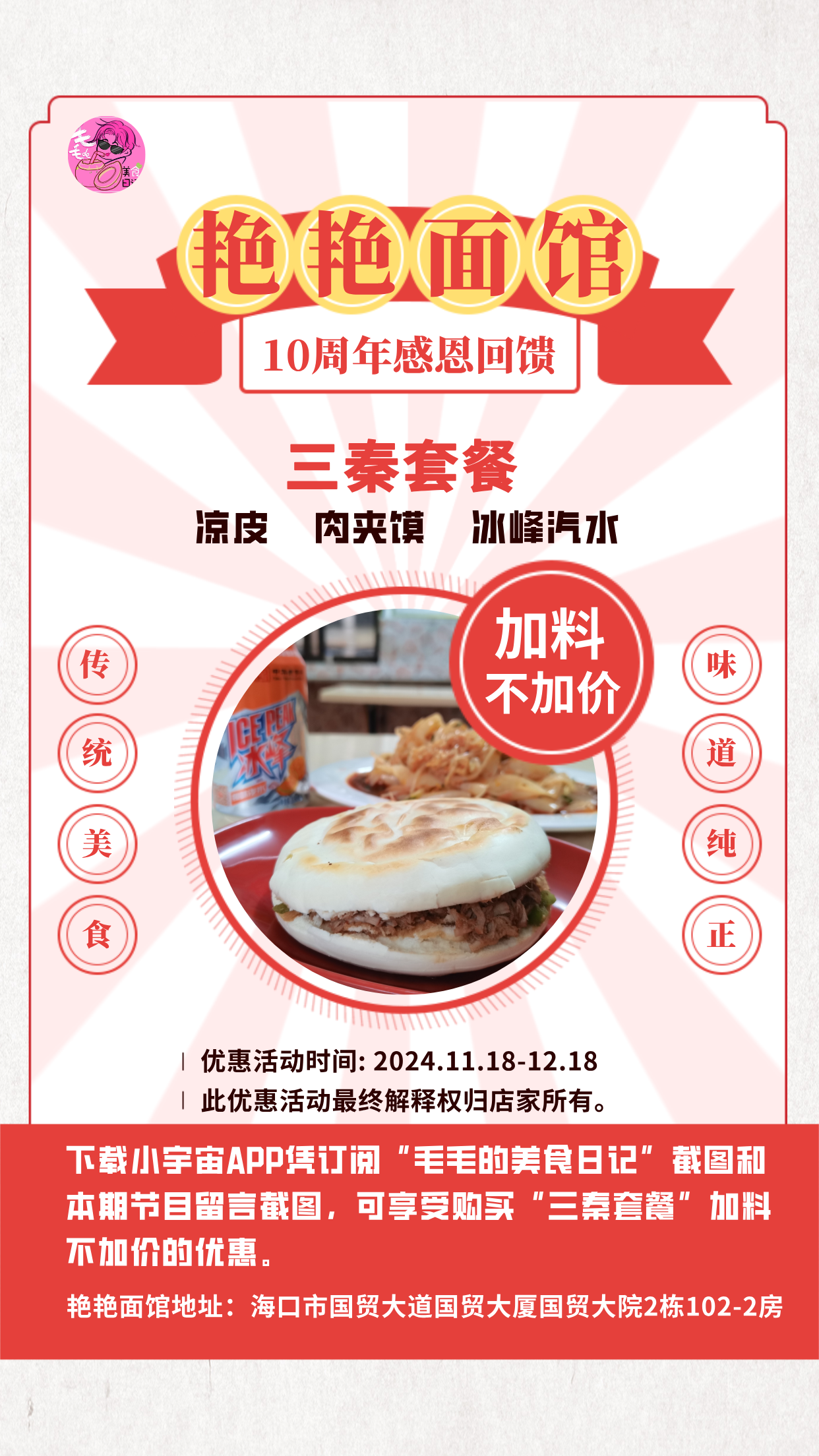 本期节目特别推出了听友独家福利!请大家先下载小宇宙APP订阅《毛毛的美食日记》,订阅并收听第七篇 《消失的白吉馍 | 和海口陕西艳艳面馆的老板聊聊她坚守半生的传统手工面食》的节目。听友凭订阅记录和在本期节目下的评论区留言,在艳艳面馆消费“三秦套餐”(肉夹馍、凉皮和冰峰汽水)可获“加料不加价”优惠。
