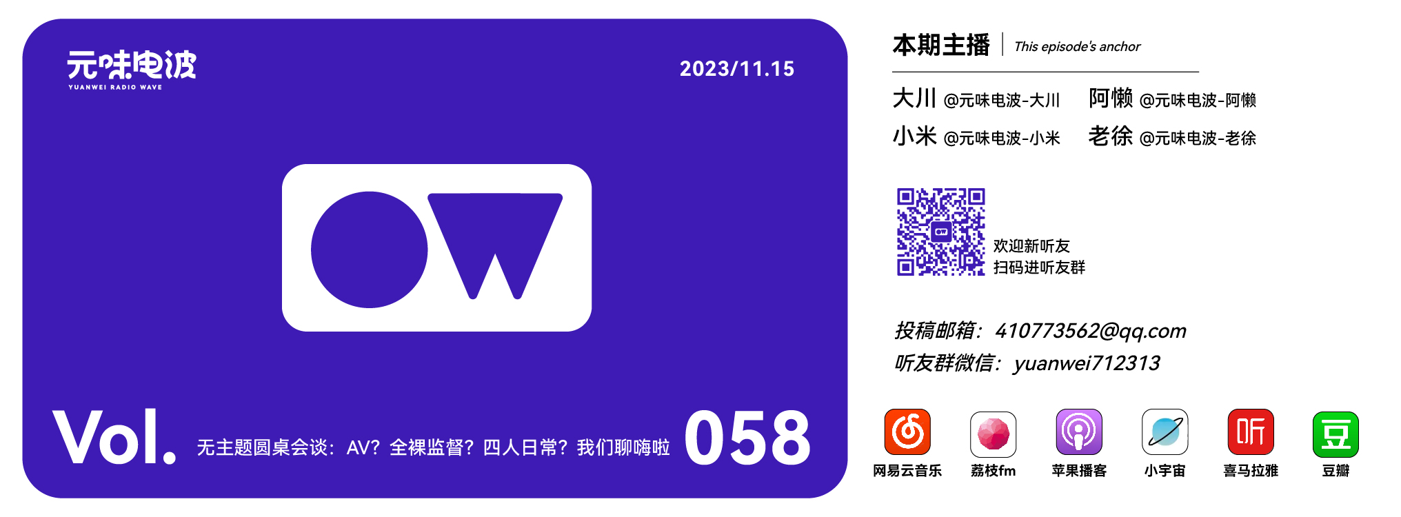 我们的节目,您可以在小宇宙、喜马拉雅、网易云音乐、荔枝 FM、荔枝播客搜索「元味电波」来订阅、收听。如果喜欢我们,也可以分享给你身边的朋友!