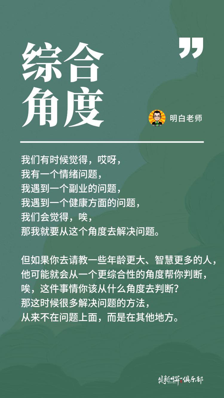但如果你去请教一些年龄更大、智慧更多的人,他可能就会从一个更综合性的角度帮你判断,唉,这件事情你该从什么角度去判断?那这时候很多解决问题的方法,从来不在问题上面,而是在其他地方。