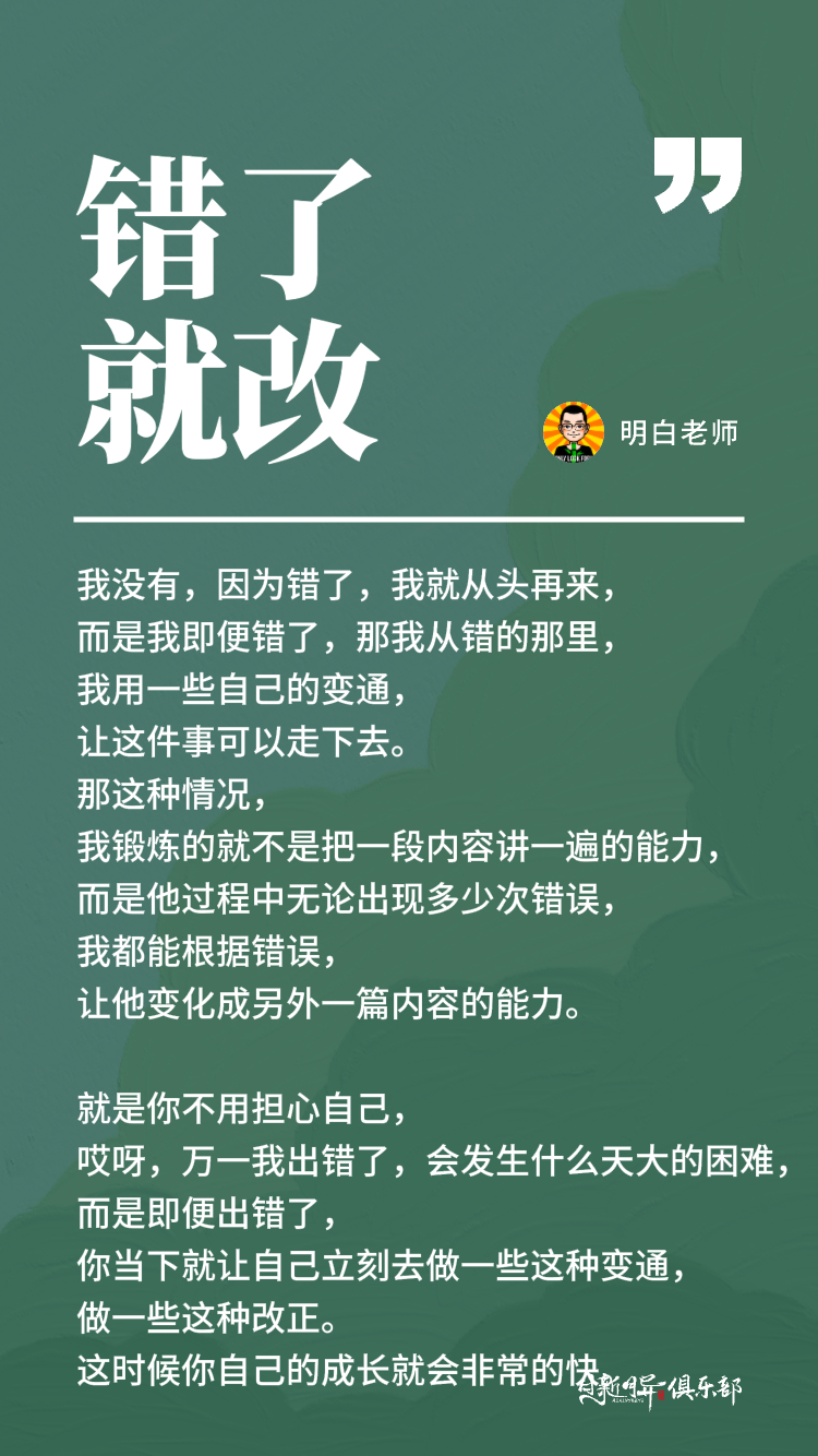 这时候当你不害怕犯错,你的心态就很稳定。这时候你反而更不容易出错,所以我们要锻炼自己,这方面的一个能力,就是你不用担心自己,哎呀,万一我出错了,会发生什么天大的困难,而是即便出错了,你当下就让自己立刻去做一些这种变通,做一些这种改正。这时候你自己的成长就会非常的快。