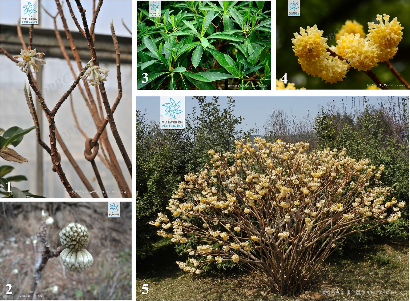 图1:被打结的结香枝条;图2:结香未开放的花序;图3:结香的叶;图4:结香开放的花序;图5:开花时的结香植株(图源见水印)