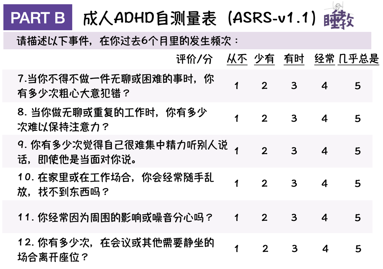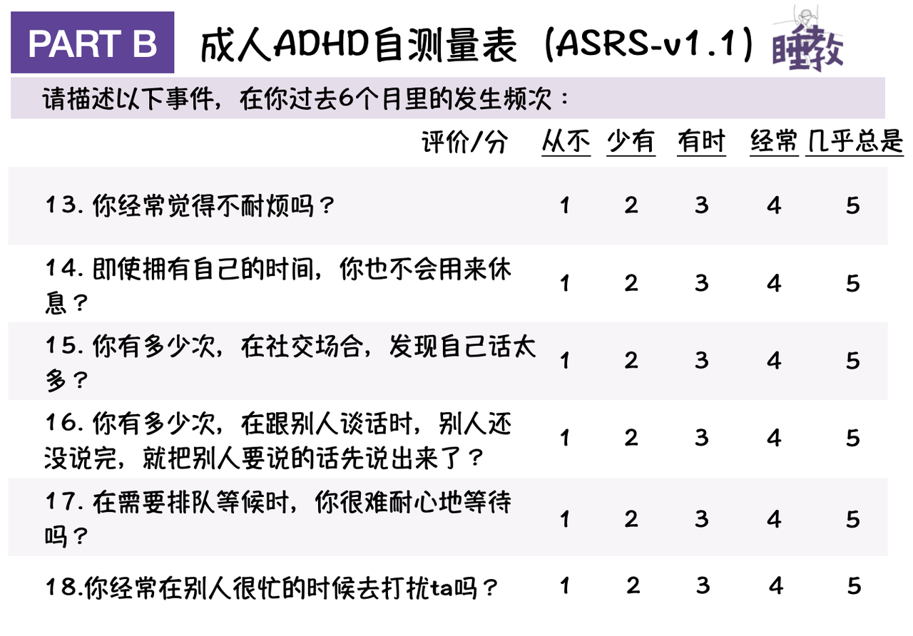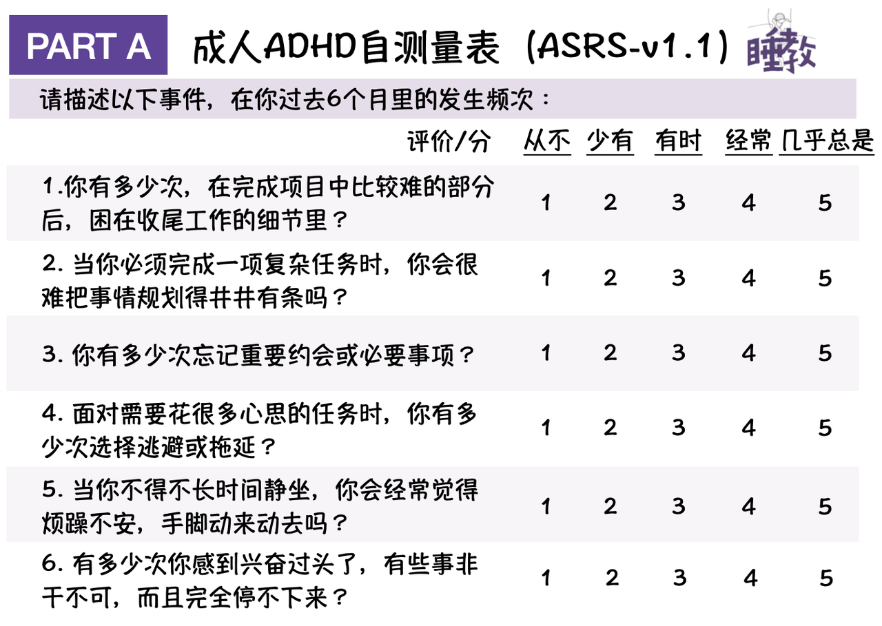 A部分有6个问题,用来看你是不是符合ADHD的核心症状,有没有「注意力缺陷」和「多动冲动」。