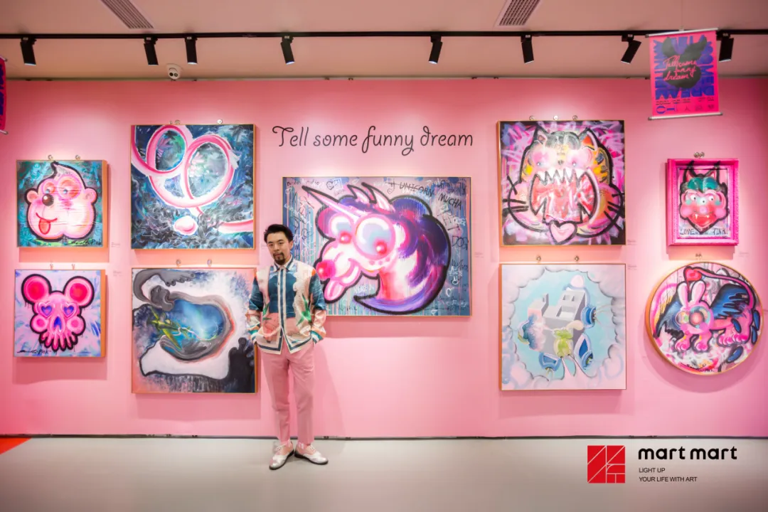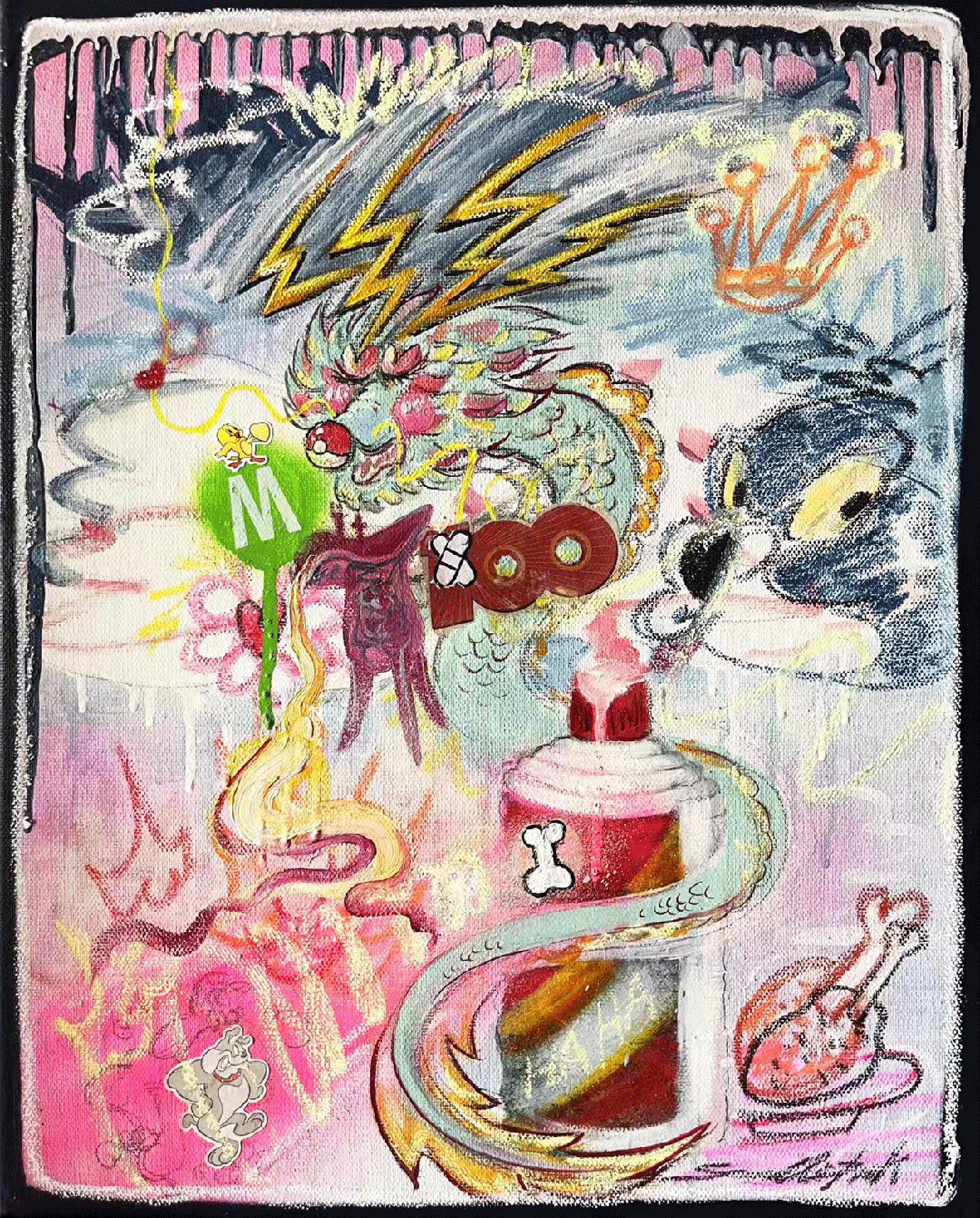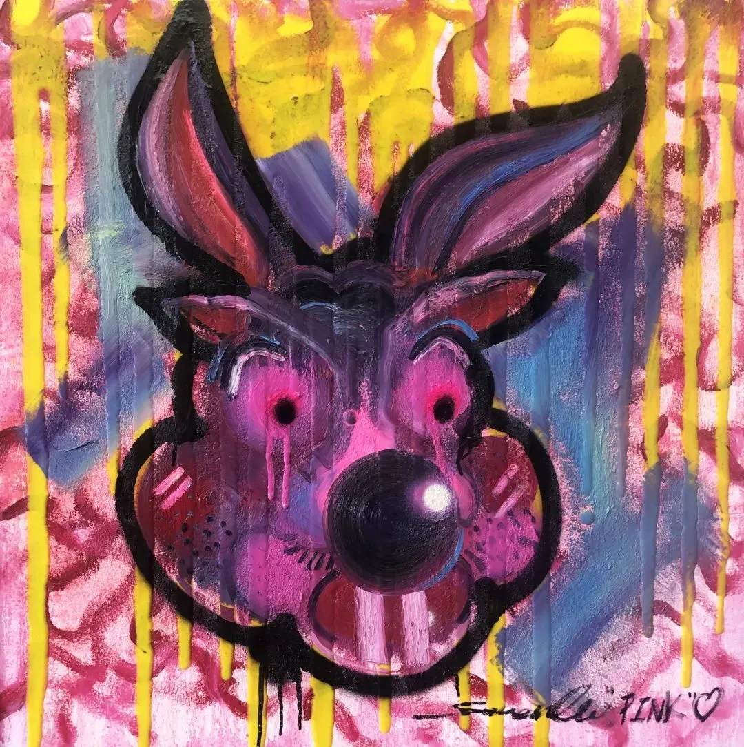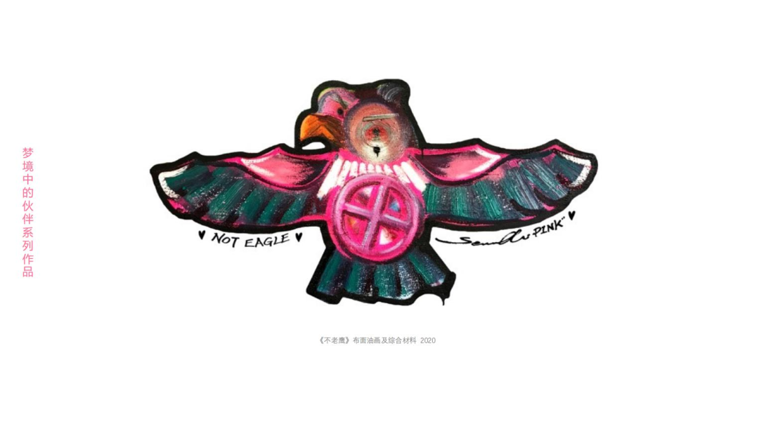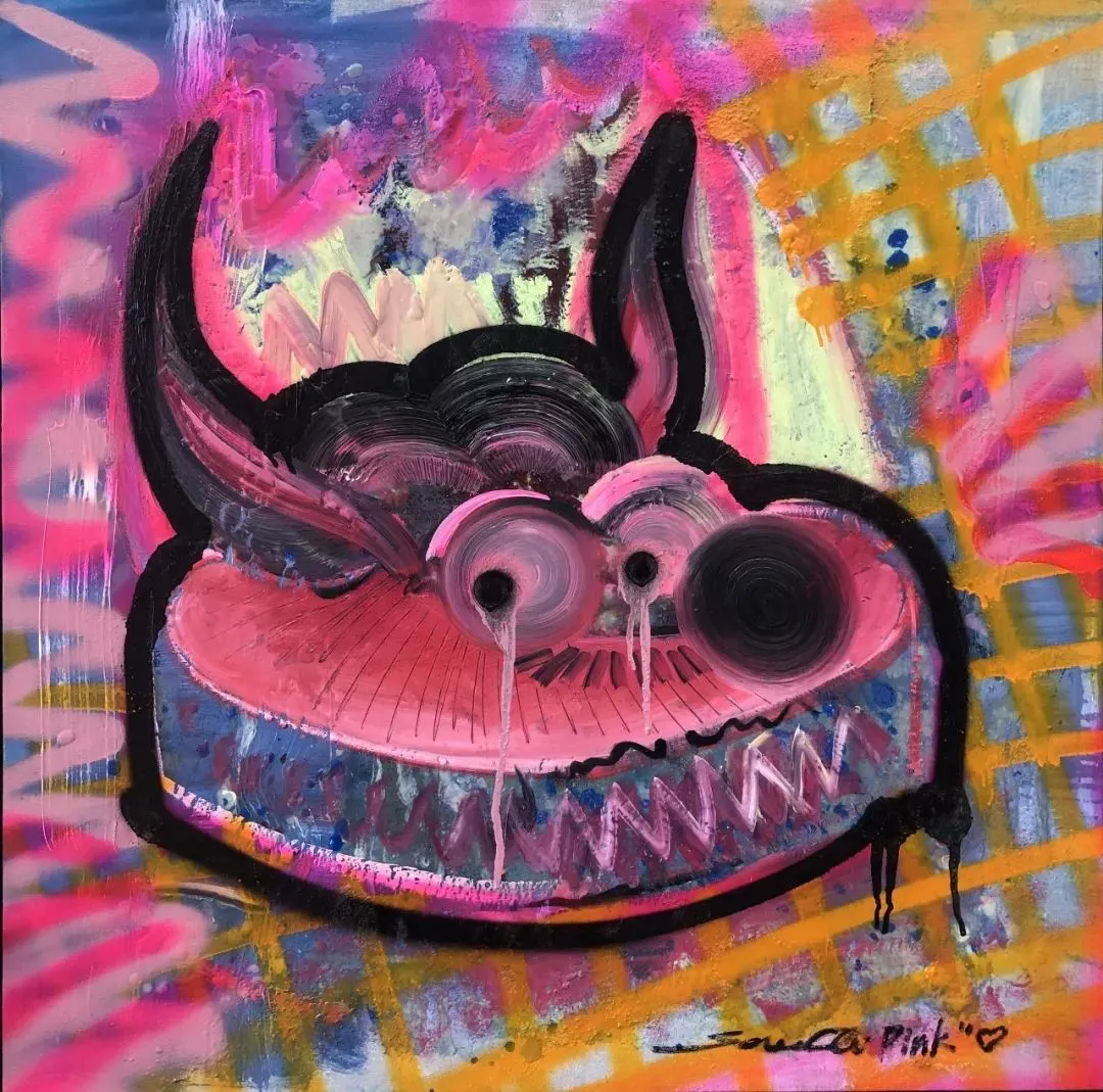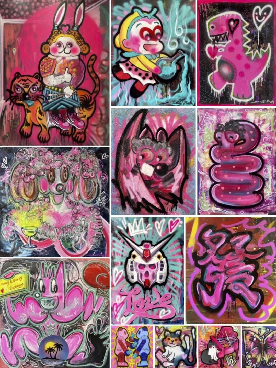 作品风格以油画和喷漆的形式相结合来诠释脑海中的世界。粉红色在艺术家心中代表爱与未来,也用作品传播爱与未来。“生活不只有艺术,但艺术可以让我更好的去生活”用创作这种方式跟这个世界交流,一幅作品便是自己的一段思想,一个思考的节点和未来的一个画面。