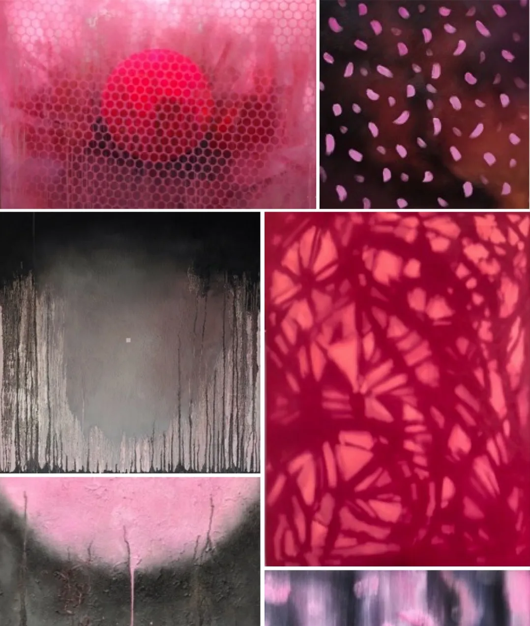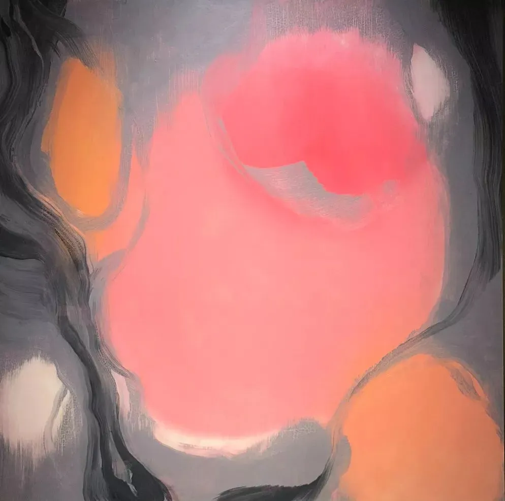 2014年我创做了第一个粉色作品,第一个作品画的是一个粉色的凋谢的玫瑰,但是是一个很抽象的话啊,背景是深红色,然后有一点黑,然后有一点暖色就咖啡色色系,然后前面是飘落的粉色的花瓣,浅色的笔触很厚的块面。