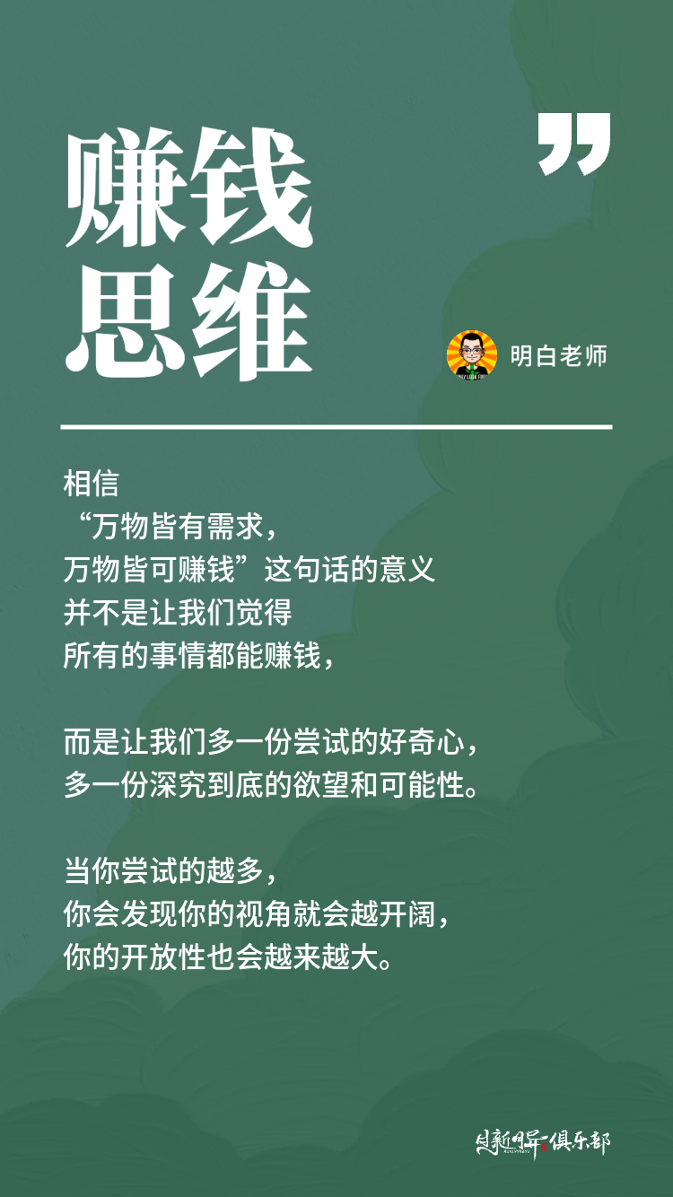 所以相信万物皆有需求,万物皆可赚钱。这句话的意义并不是让我们觉得所有的事情都能赚钱,而是让我们多一份尝试的好奇心,多一份深究到底的欲望和可能性。当你尝试的越多,你会发现你的视角就会越开阔,你的开放性也会越来越大。