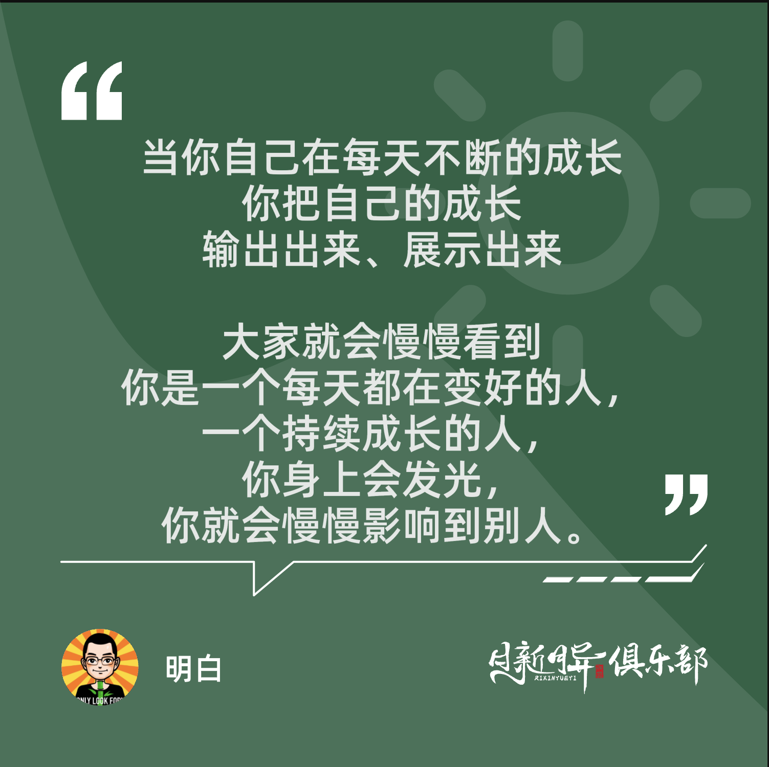 当你自己在每天不断的成长,以及你把自己的成长输出出来、展示出来,大家就会慢慢看到你是一个每天都在变好的人,一个持续成长的人,他身上会发光,他就会慢慢影响到别人。