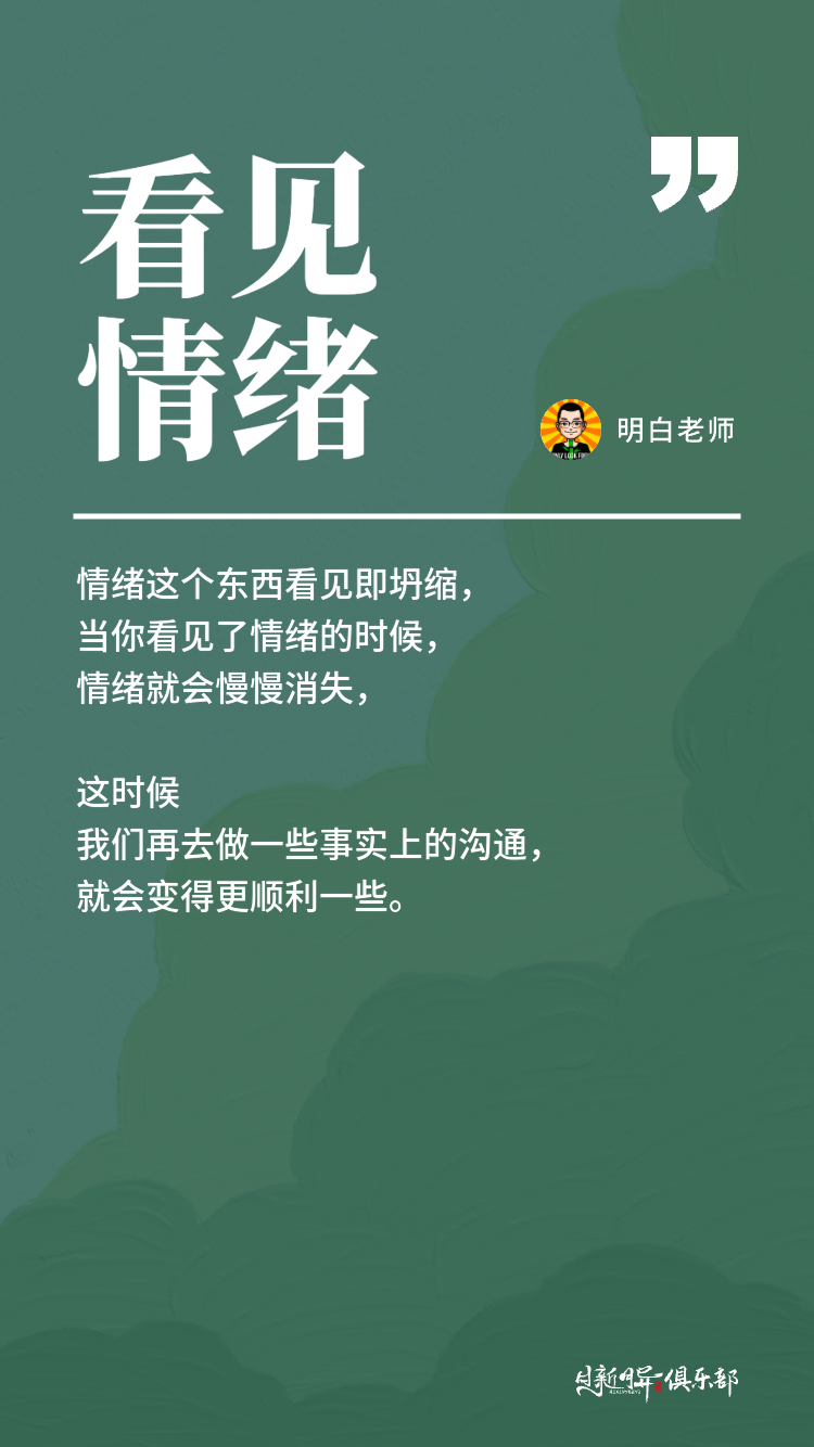 这时候情绪这个东西看见即坍缩,就当你看见了情绪的时候,情绪就会慢慢消失,这时候我们再去做一些事实上的沟通,就会变得更顺利一些。