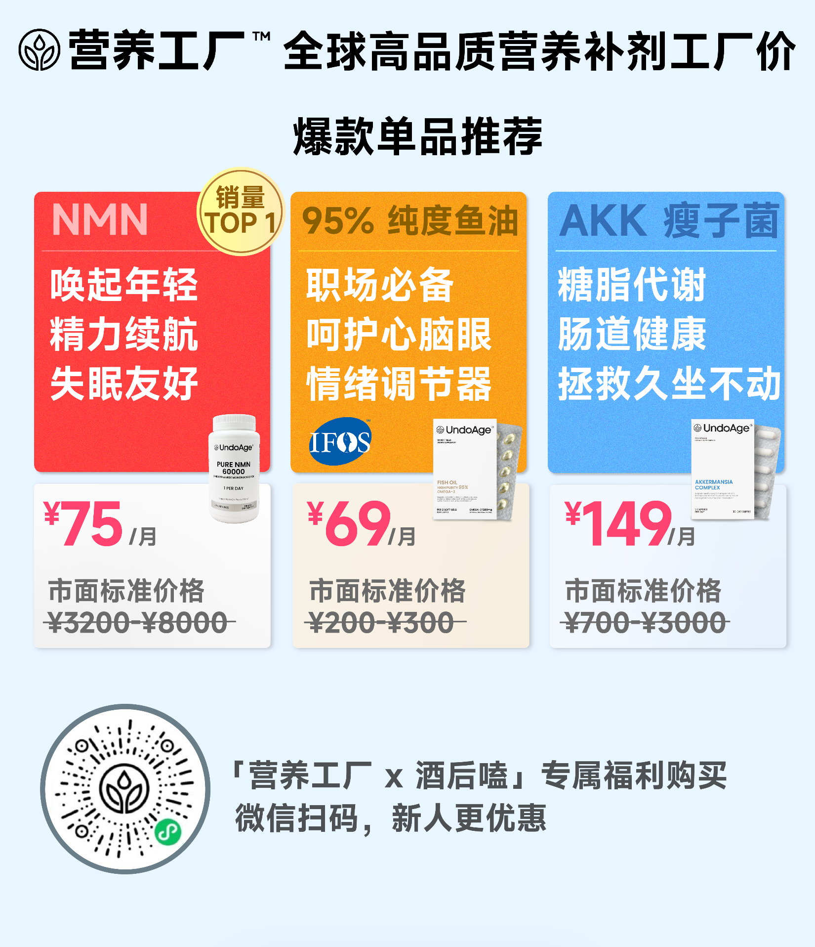 - 选购更多补剂,截图或保存下方图片到微信扫码,进入营养工厂微信小程序,可参考首页“健康需求”板块,包括减脂、抗衰、皮肤、睡眠等多种分类,都有对应的补剂搭配,帮你一键直达适合自己的产品。