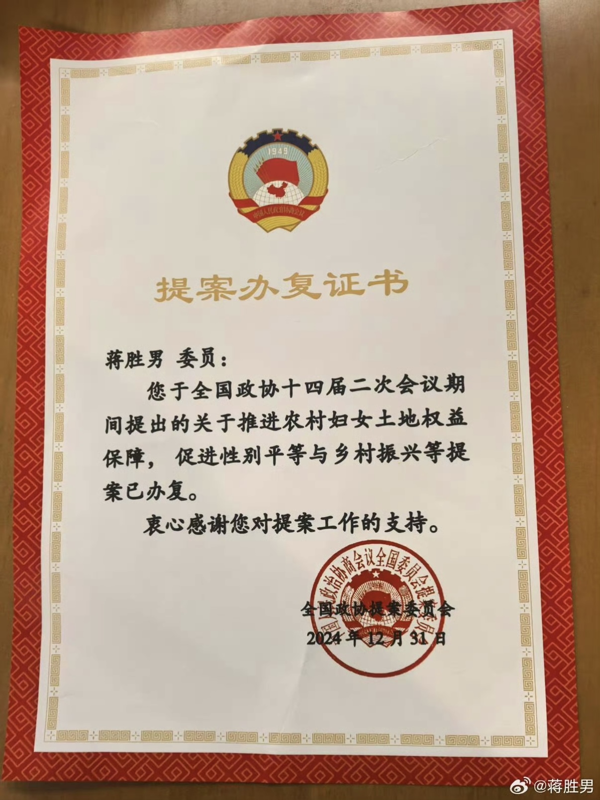 蒋胜男委员关于保障农村妇女土地权益的提案已经办复+伴生的彩礼议题+再提取消离婚冷静期