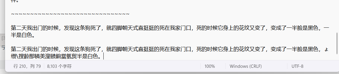 老于的投稿是投稿人让朋友转述,代投的,虽然没有给我说明任何事情,但我觉得不简单,因为在收录投稿的时候,老于也遇到怪事了。对方发来的图片投稿,老于需要复制成文字放入稿库,复制了N次,有一段文字一直是乱码,可以看下图。