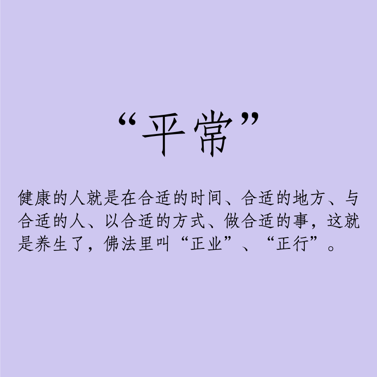 所谓养生与调理,最重要的是尽可能让自己找到安心与舒服的平常状态,健康的人就是在合适的时间、合适的地方、与合适的人、以合适的方式、做合适的事,这就是养生了,佛法里叫“正业”、“正行”。