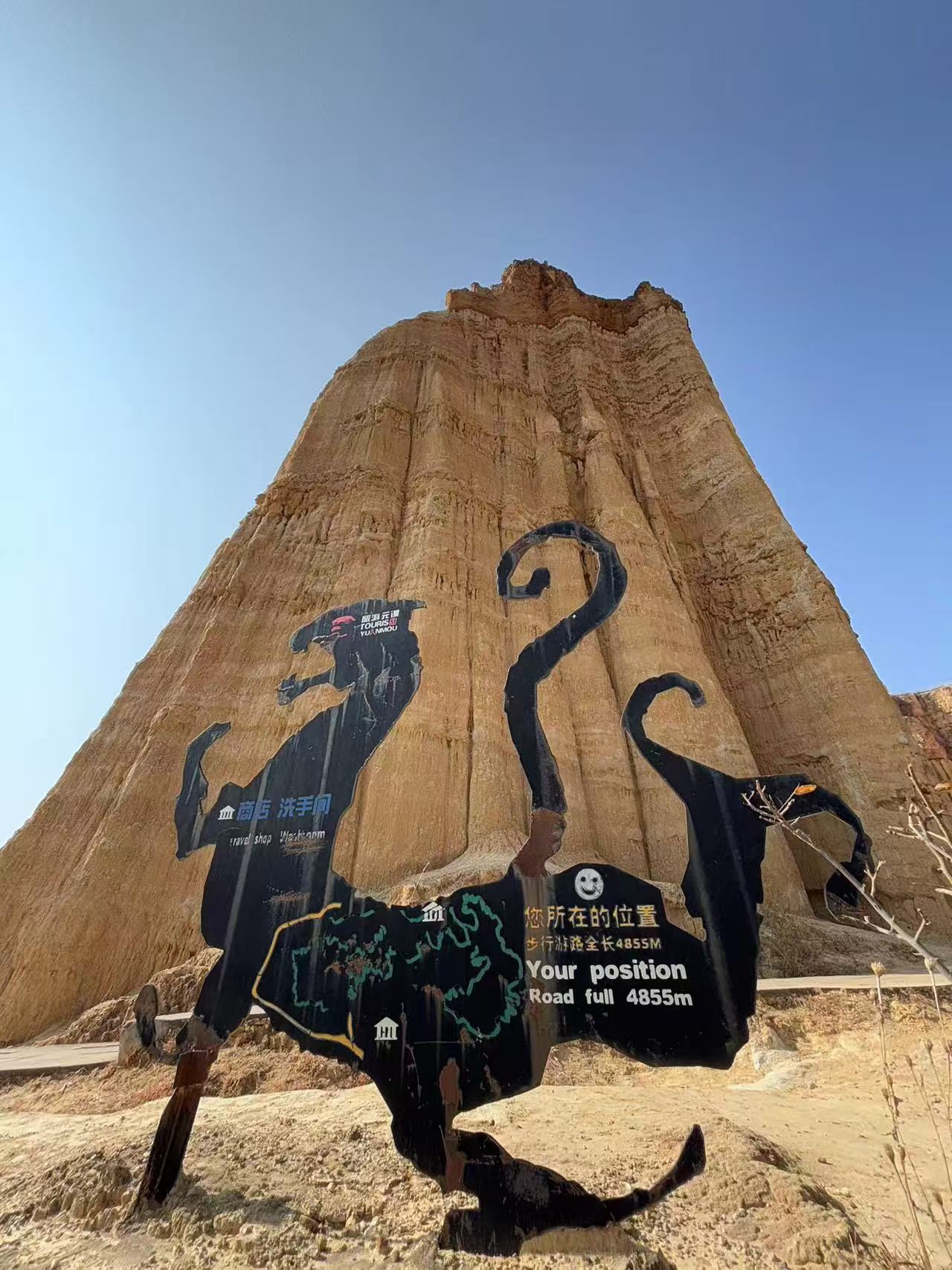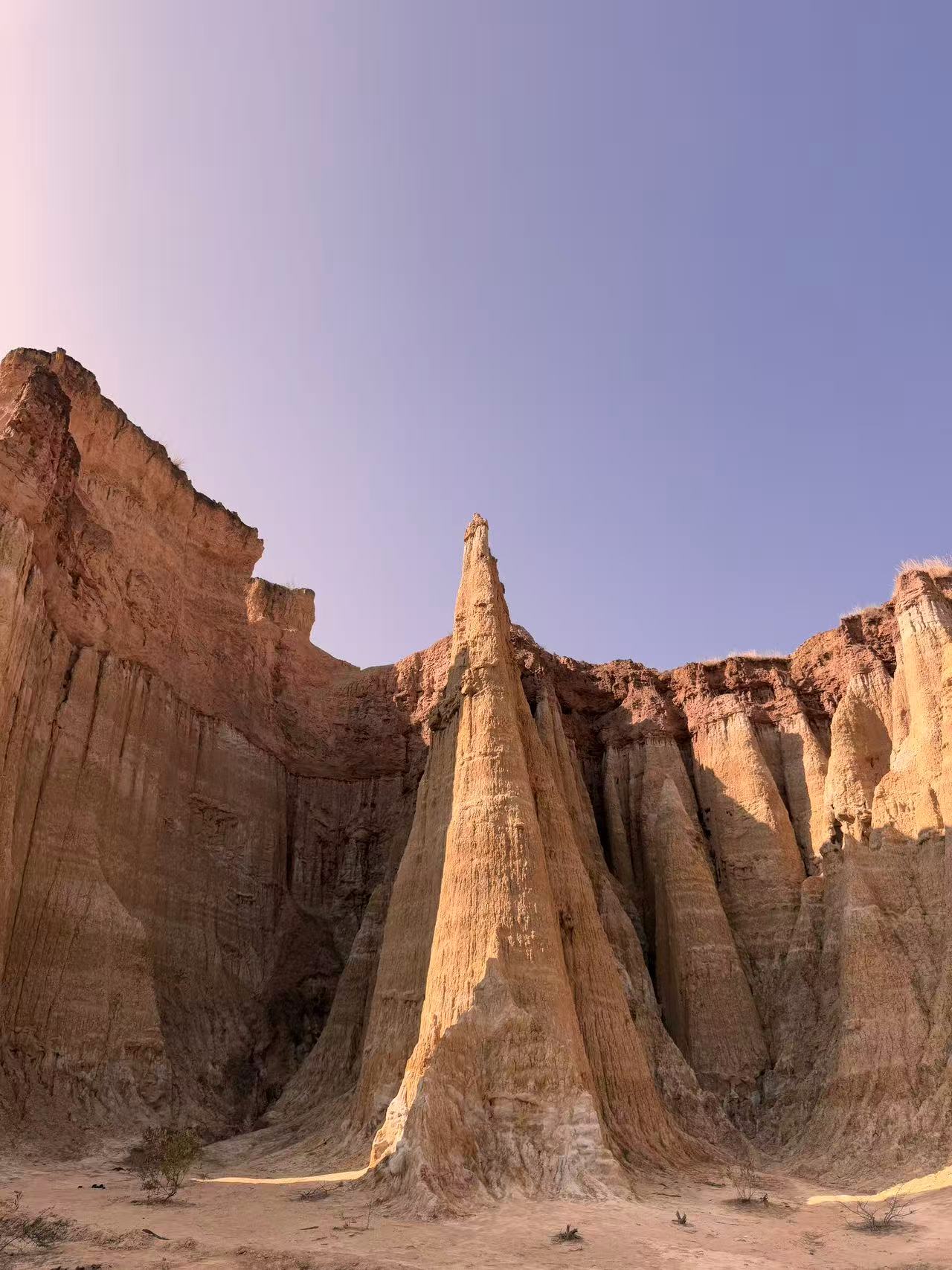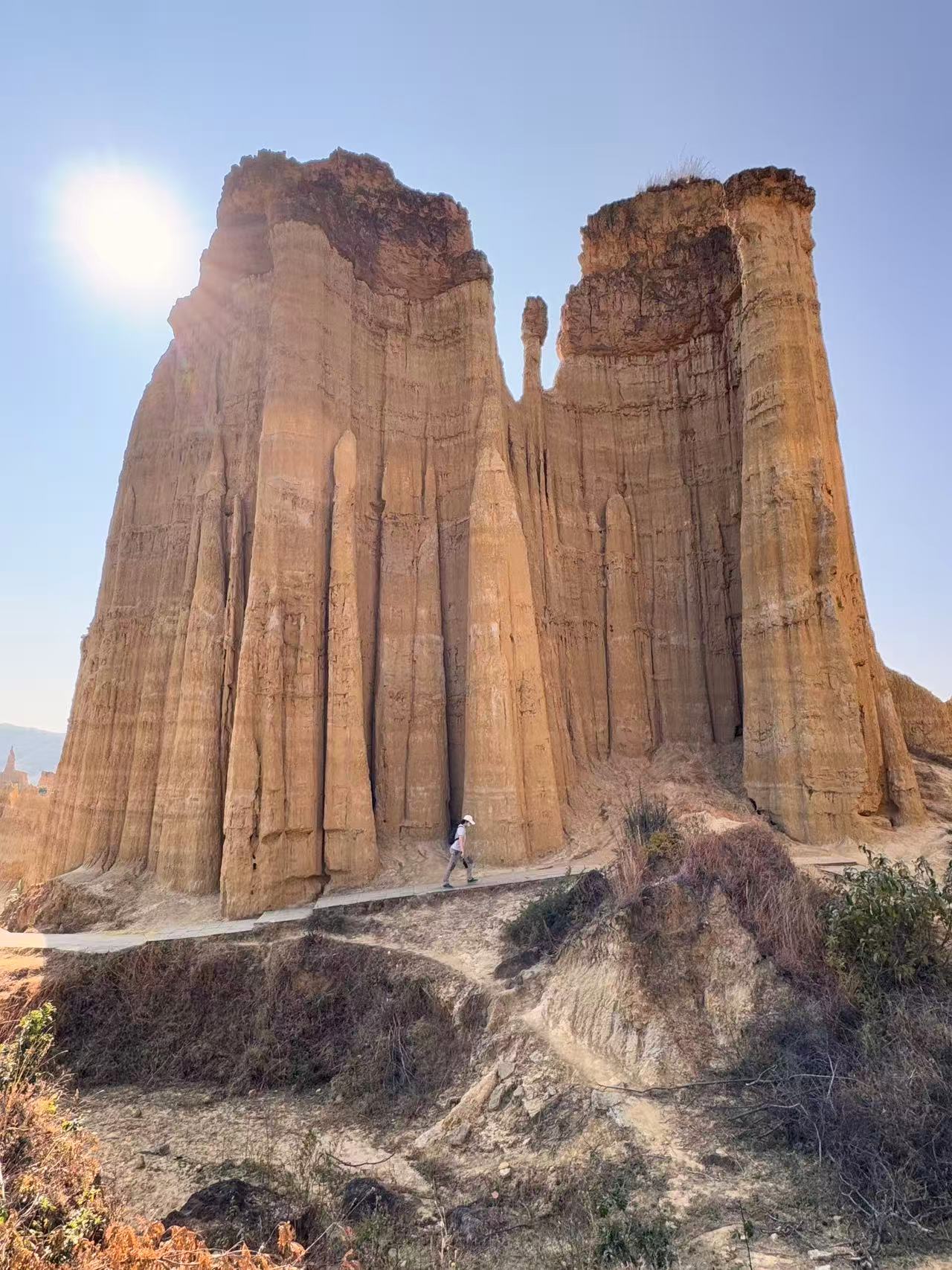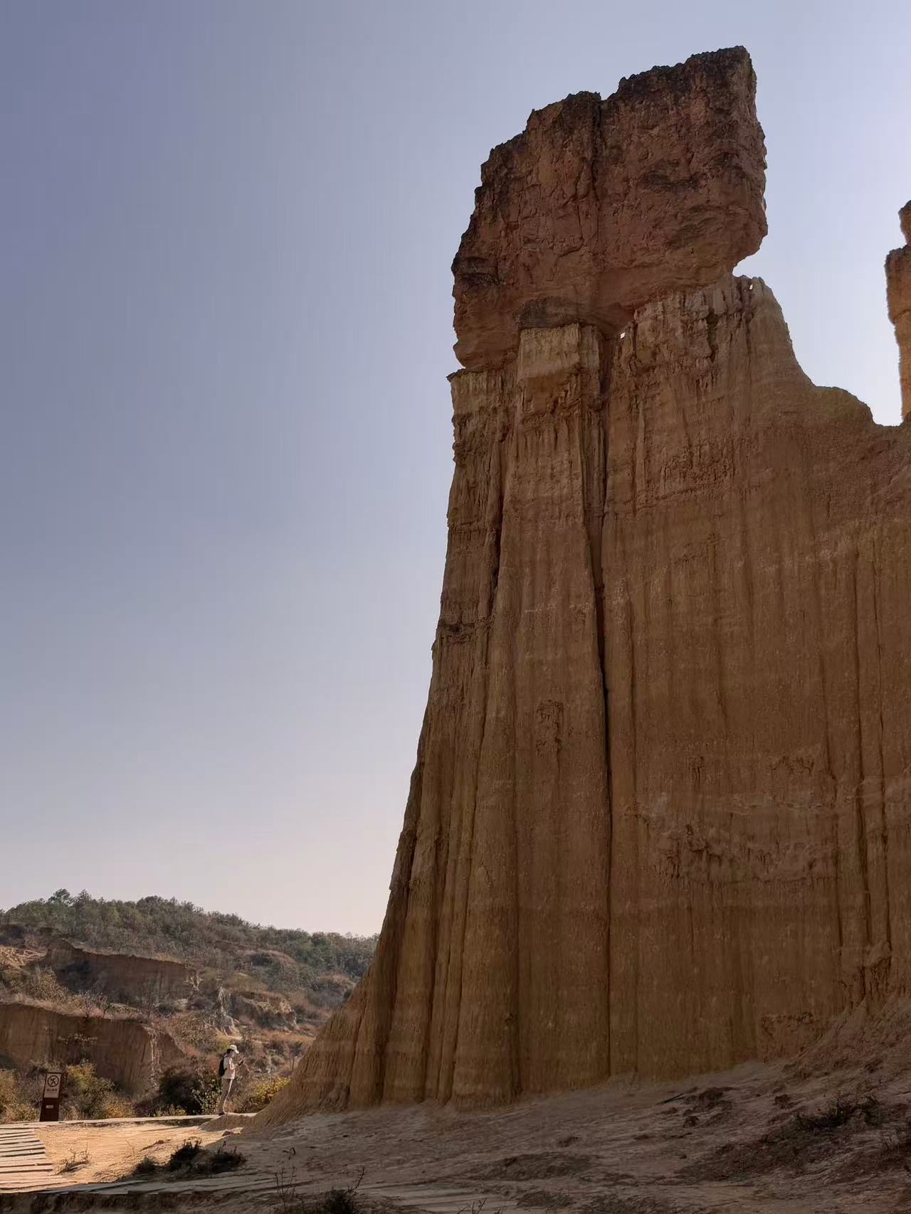 拍,一顿咔咔拍,各种角度拍,平台上拍完再下到土林脚下去拍——拍大片的屏障,拍一根根的土笋,拍分层的纹理,拍紫红的铁帽子——在这里我们直观感受人类的渺小,但并不因此而难过,一定是太阳太暖了吧。