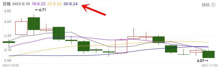 刚才说过,不同的软件均线的颜色可能不太一样,那我们要如何准确的分辨它们的呢?答案很简单,大家仔细看文稿中的图片,图中左上角有一排数字,这一排数字明确记录了不同周期的均线代表什么颜色,以及这些均线所对应的股价是多少。比如第一段字写的是“日线”,说明你看的这张k线图是日k线图,后面的英文字母写着MA5:6.16。MA5表示的是5日均线,后面的6.16代表5日均线对应的股价是6.16元。