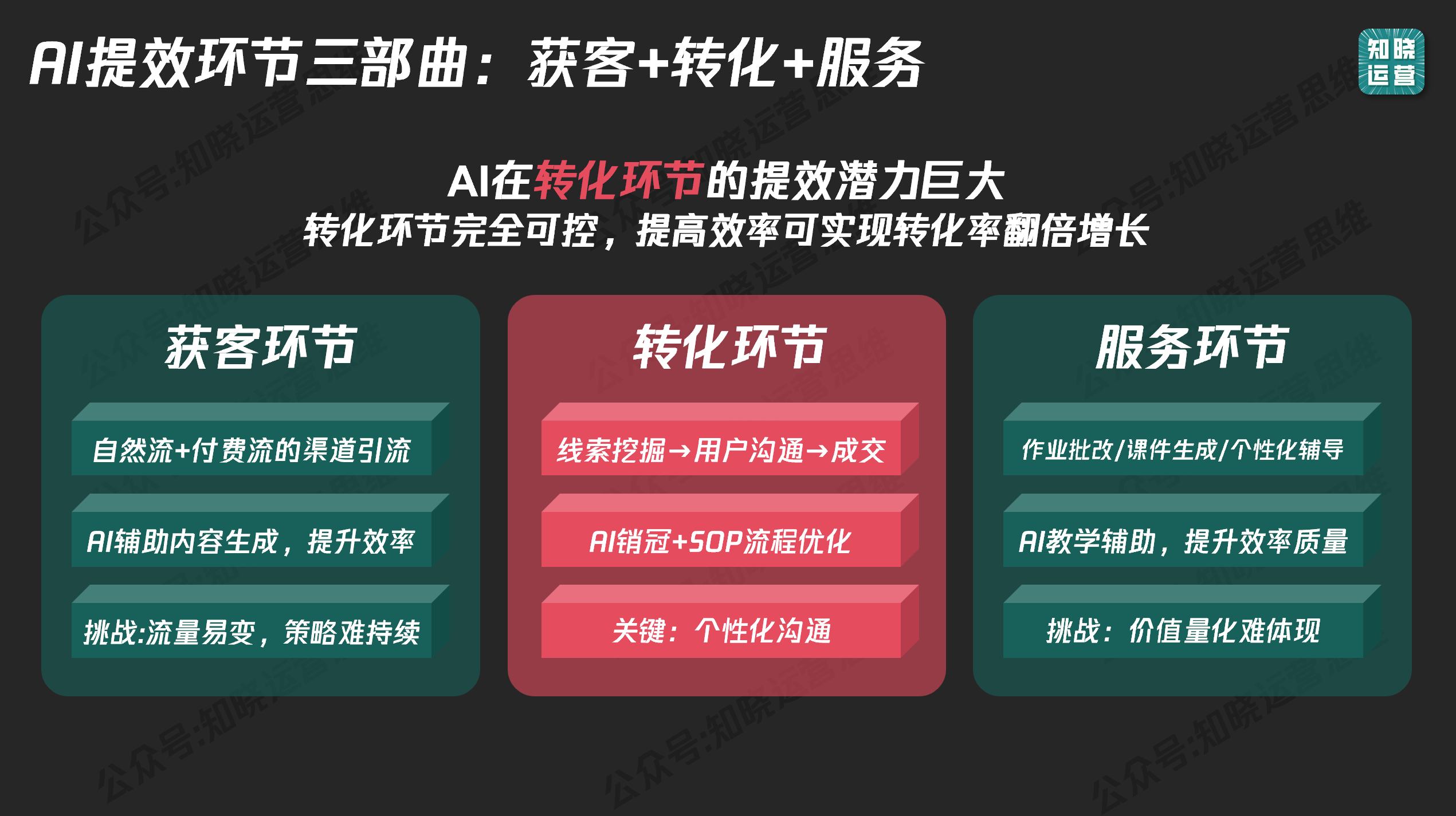 本期主要探讨教培行业如何利用AI赋能私域运营来提高效率并突破困境,讲述AI在教育行业获客、转化和服务交付三个关键环节的应用潜力与面临的挑战。
