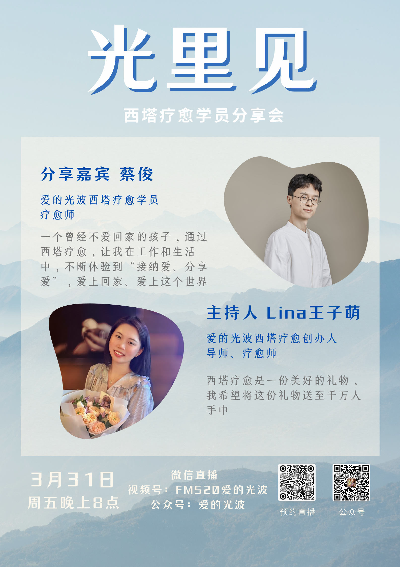 伙伴你好,我是萌萌,是播客《爱的光波》主理人,也是一名西塔疗愈师、导师。《光里见》是西塔疗愈方向的专题录播,每一期,我会邀请西塔疗愈师、导师们来分享ta们的西塔疗愈之旅