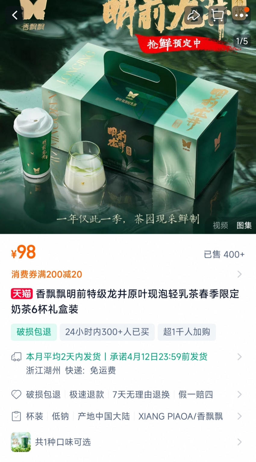 3 月 28 日,这款产品正式开售,并且 3 月 31 日同步上架线下门店。从电商平台的销售数据来看,该款产品已售出 400 多件,还有超 1 千人加购,似乎有一定的市场吸引力。但在业内人士看来,香飘飘此次涨价并推出高端产品,是其试图突破冲泡产品局限、与现制茶饮品牌竞争的重要举措。自去年以来,香飘飘就开启了 “新派茶饮” 的转型之路,在线下市场频频发力。