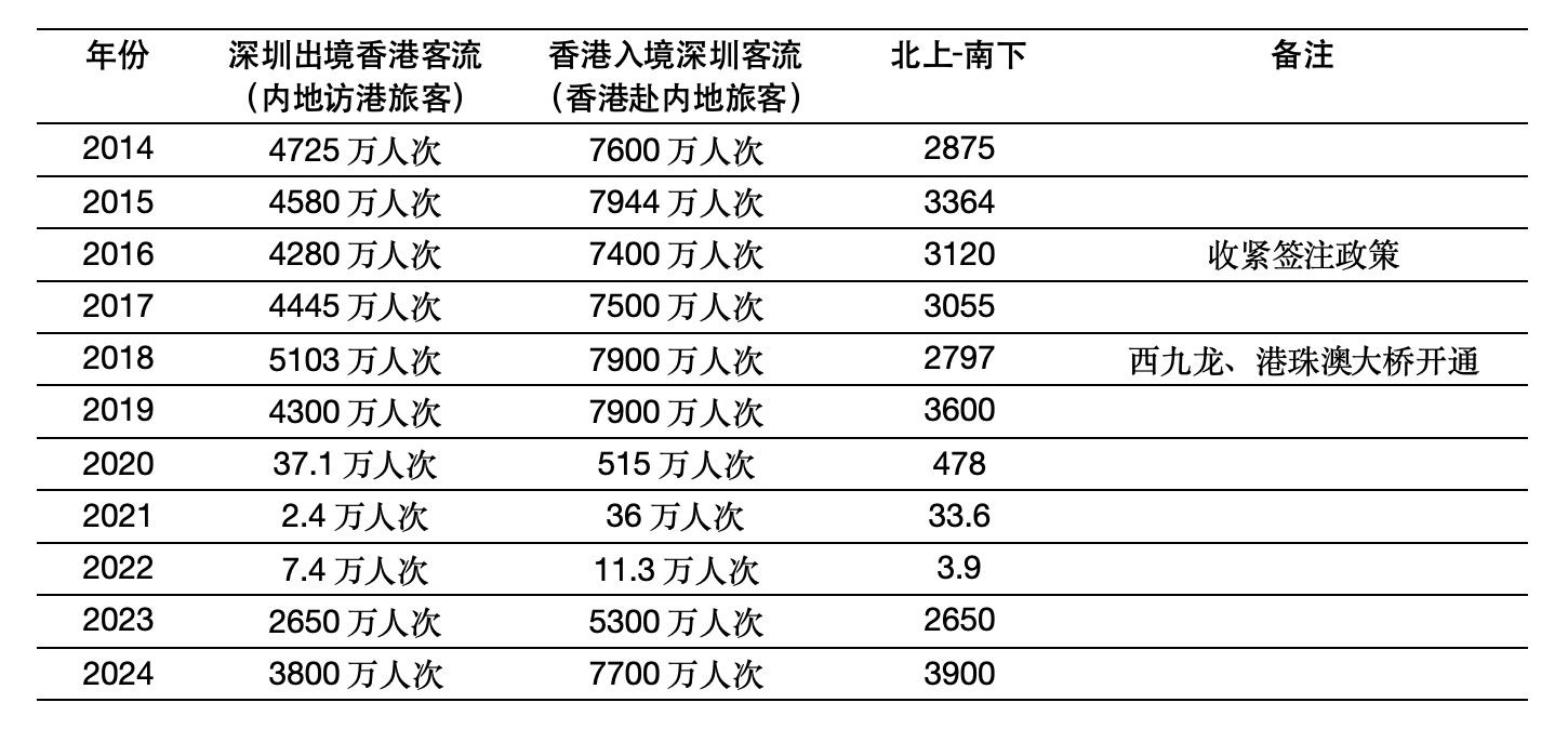 本期是《港澳新鲜事》第10期,很有标志性。2025年8月16日,深港陆路口岸创造单日102.71万人次的出入境历史记录,其中入境深圳的客流高达55.9万人次,远超赴港的46.81万人次。自2023年全面恢复通关以来,“北上”人数大于“南下”人数的趋势持续扩大(从2014年到2024年,“北上-南下”客流顺差从2875增至3900万人次)。最明显就是在深圳商场、电影院、餐厅能看到更多香港同胞身影。本期我们就从深港出入境数据变化谈起,结合@大敏的“深港”双城生活一线体感,分析客流顺差背后原因,梳理1997年回归以来深港出入境数据变化、重要节点和引发社会现象,预测香港与内地的未来新变化和趋势,最后再从政府、企业、中产角度给一些Tips……