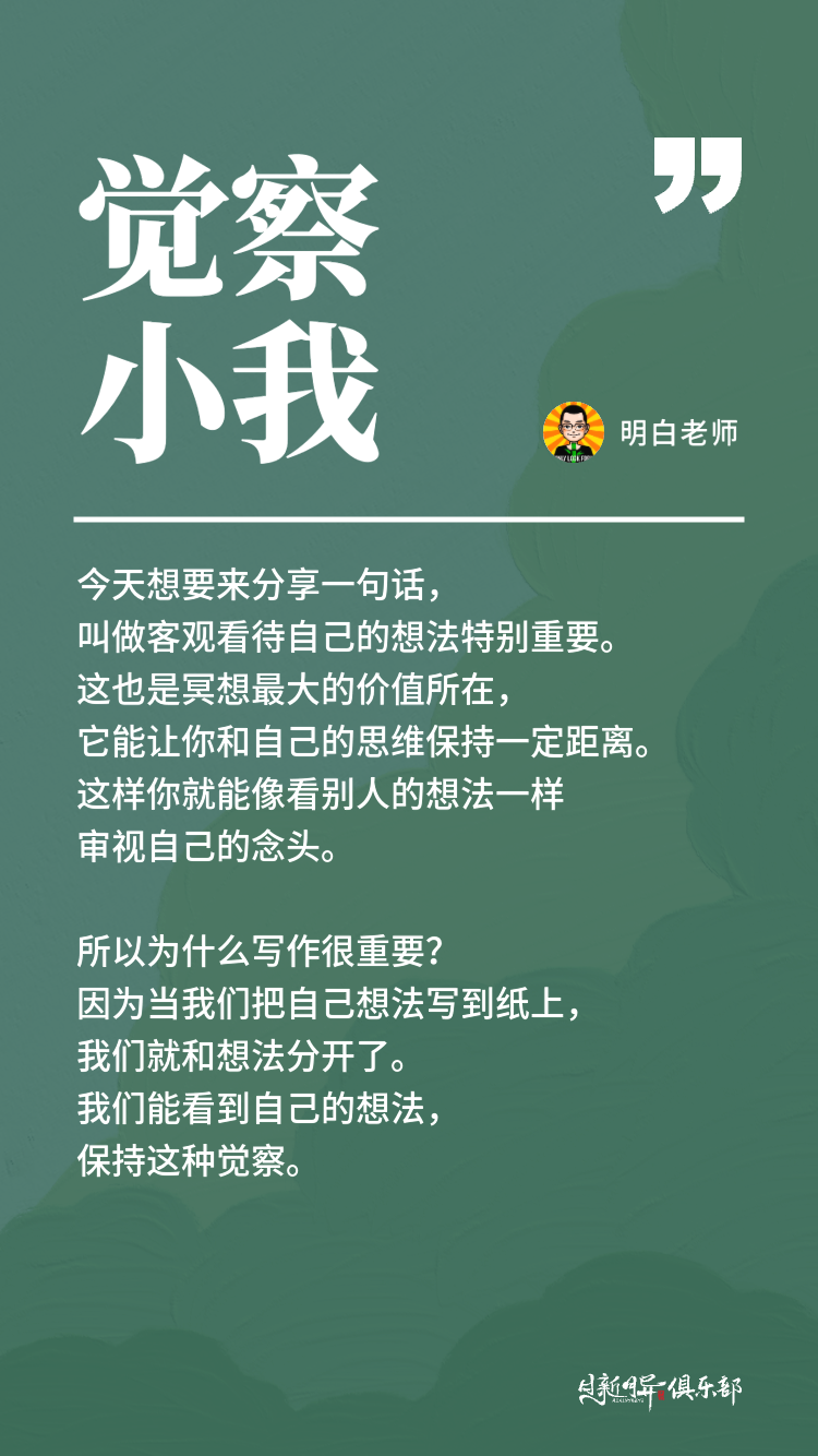 今天想要来分享一句话,叫做客观看待自己的想法特别重要。这也是冥想最大的价值所在,它能让你和自己的思维保持一定距离。这样你就能像看别人的想法一样审视自己的念头。