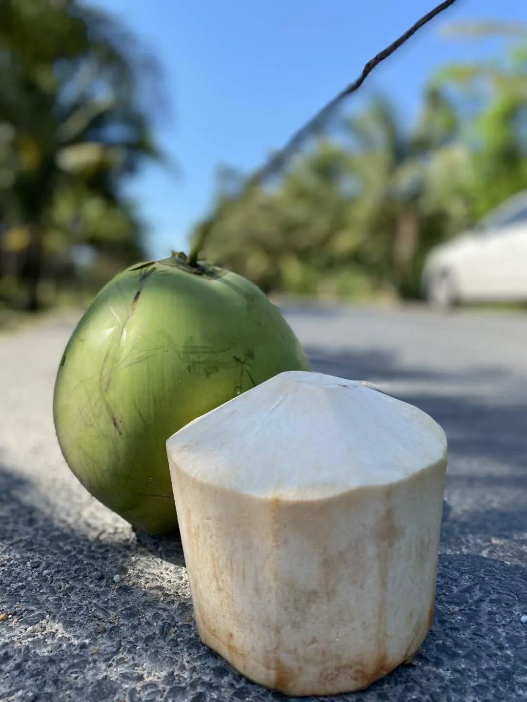 图:新鲜椰青和去皮后露出白色部分的椰青
