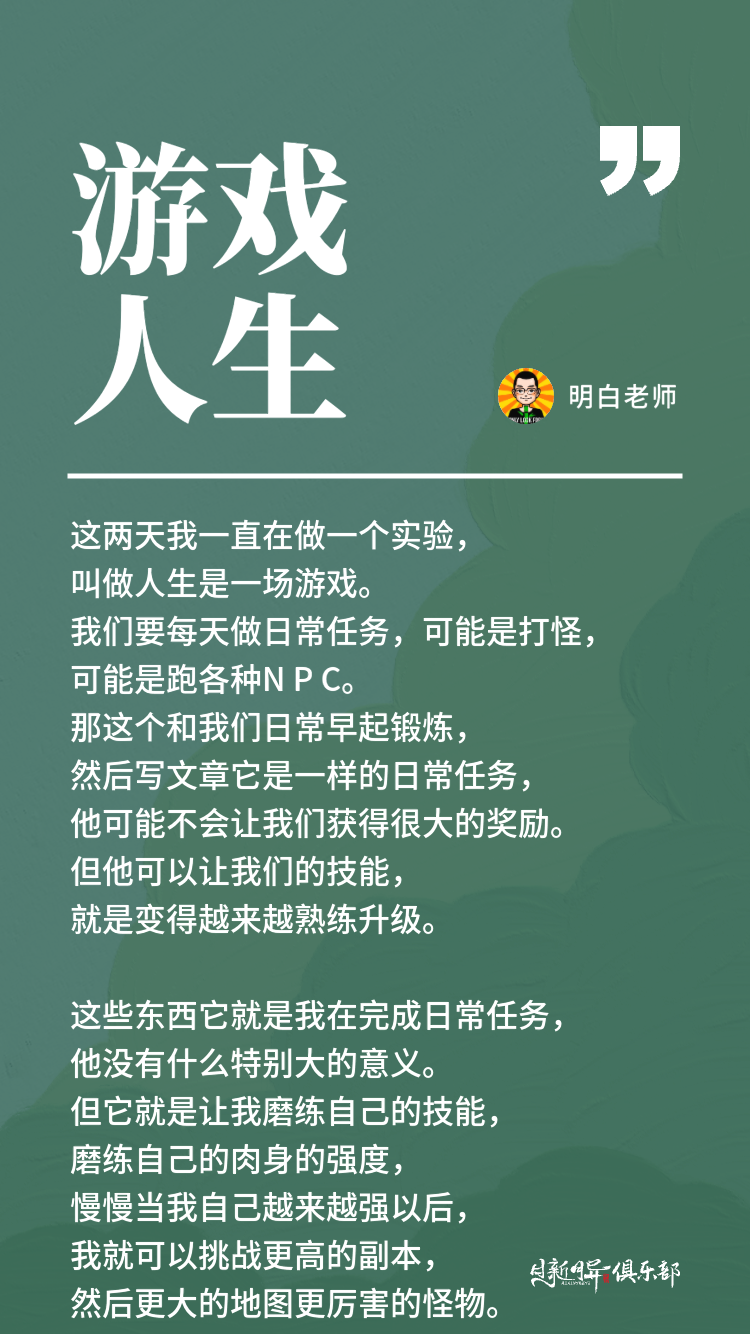 所以你看,单纯就是游戏中做日常任务这一个点,对应到现实中就会让我有很大的启发,就会让我觉得我每天的这个感恩日记也好,若干文章也好,俯卧撑也好,然后健身房也好,然后去读书也好,这些东西它就是我在完成日常任务,他没有什么特别大的意义。