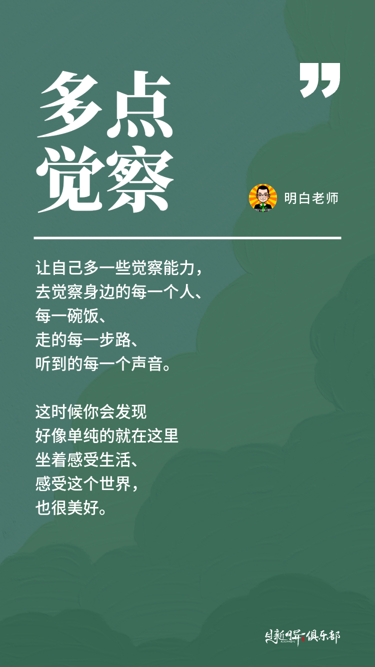 让自己多一些觉察能力,去觉察身边的每一个人、每一碗饭、走的每一步路、听到的每一个声音,这时候你会发现好像单纯的就在这里坐着感受生活、感受这个世界,也很美好。