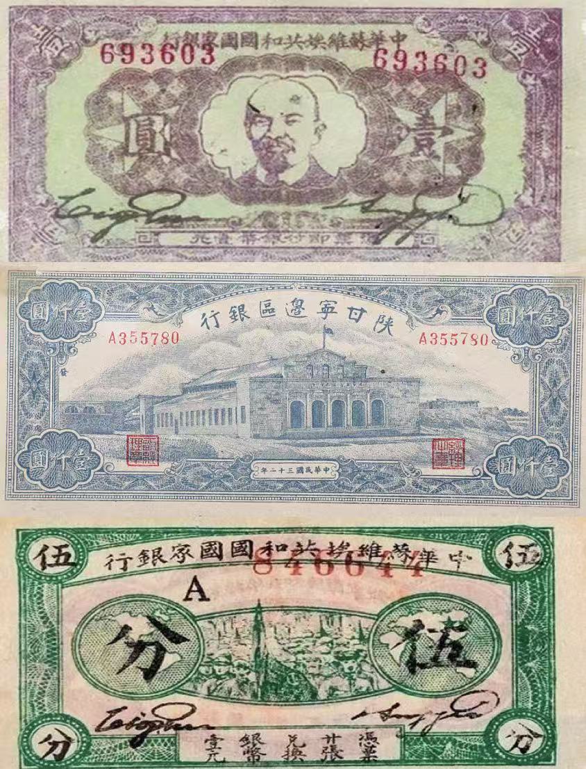 - 各个解放区发行自己的货币,如陕甘宁地区的"边币"、晋察冀地区的"抗币"