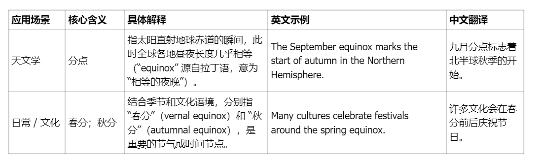 核心词性为名词,指天文学中的 “分点”,即昼夜几乎等长的时刻,一年中发生两次:春分和秋分。