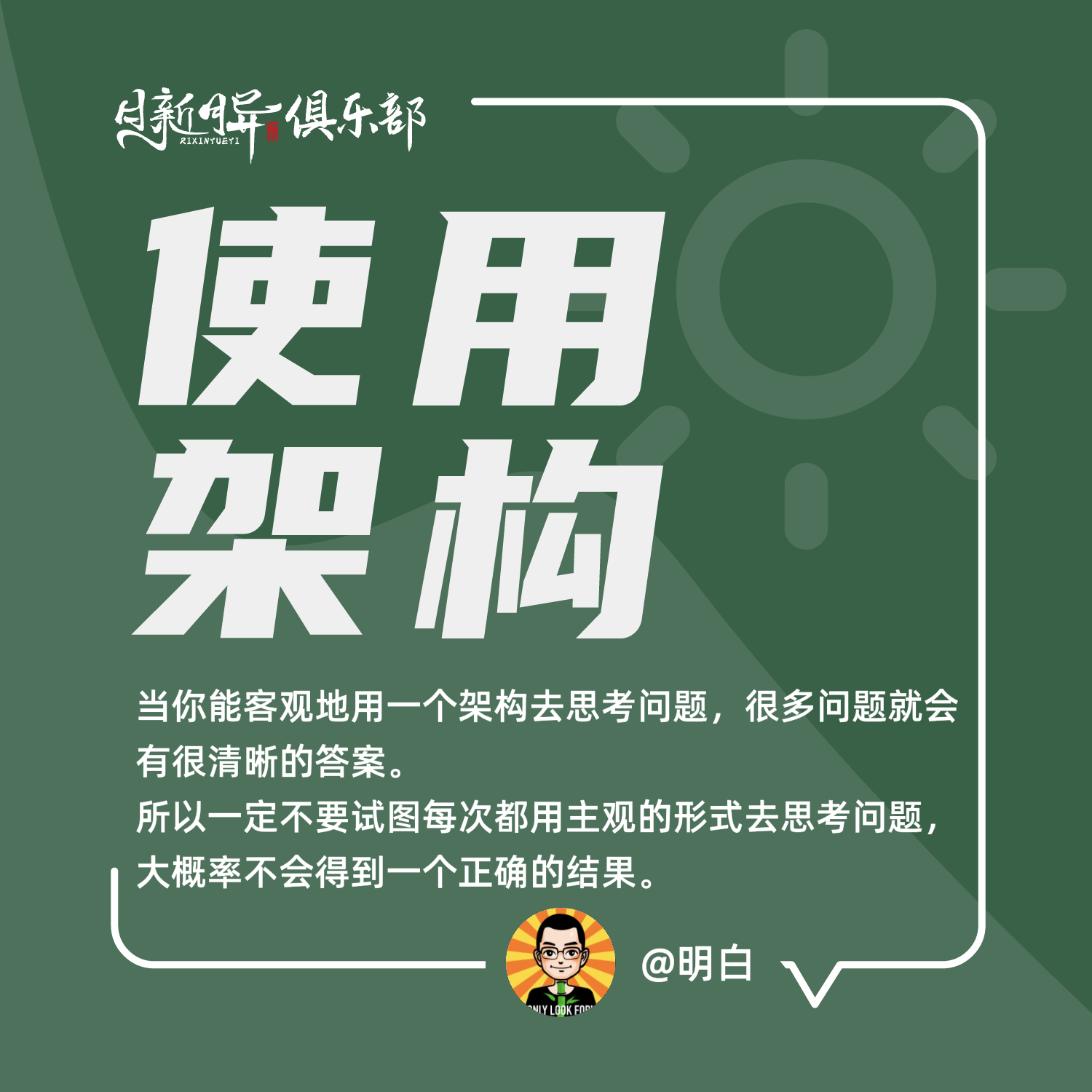 OK. 所以你无论写文章,无论是处理情绪,无论是沟通,无论是谈销售,问一下自己,你有没有一套客观的架构,让自己根据这套架构去思考问题并且做出行动。